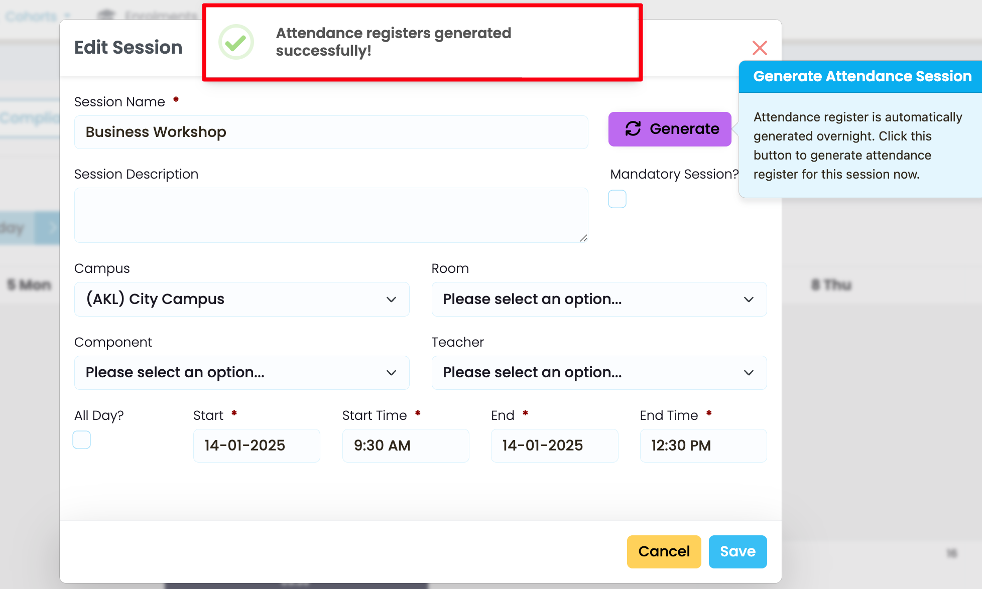 Note: The purple “Generate” button is greyed out as your session will generate overnight, automatically. However, it will be enabled after you save the session, should you need to generate an attendance register on the same day that you create a timetable session.