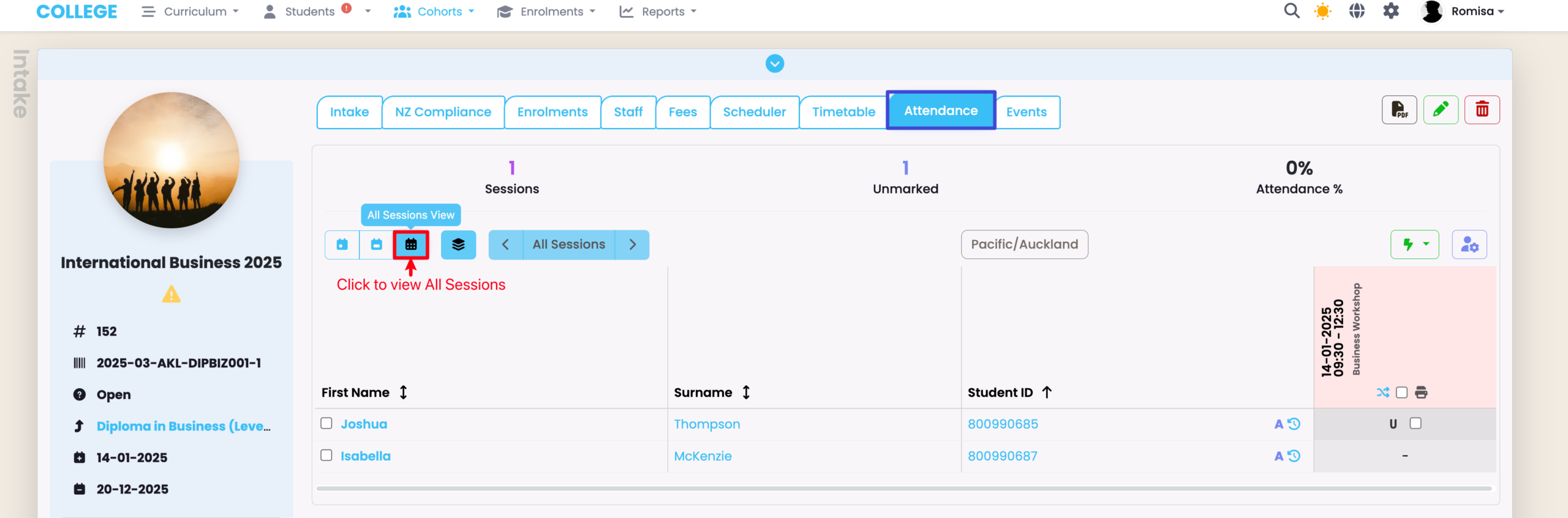 Navigate to the Intake Attendance tab, and click the “All Sessions View” (red) to see the attendance register. Please refer to Attendance – Marking Attendance in this resource for more.