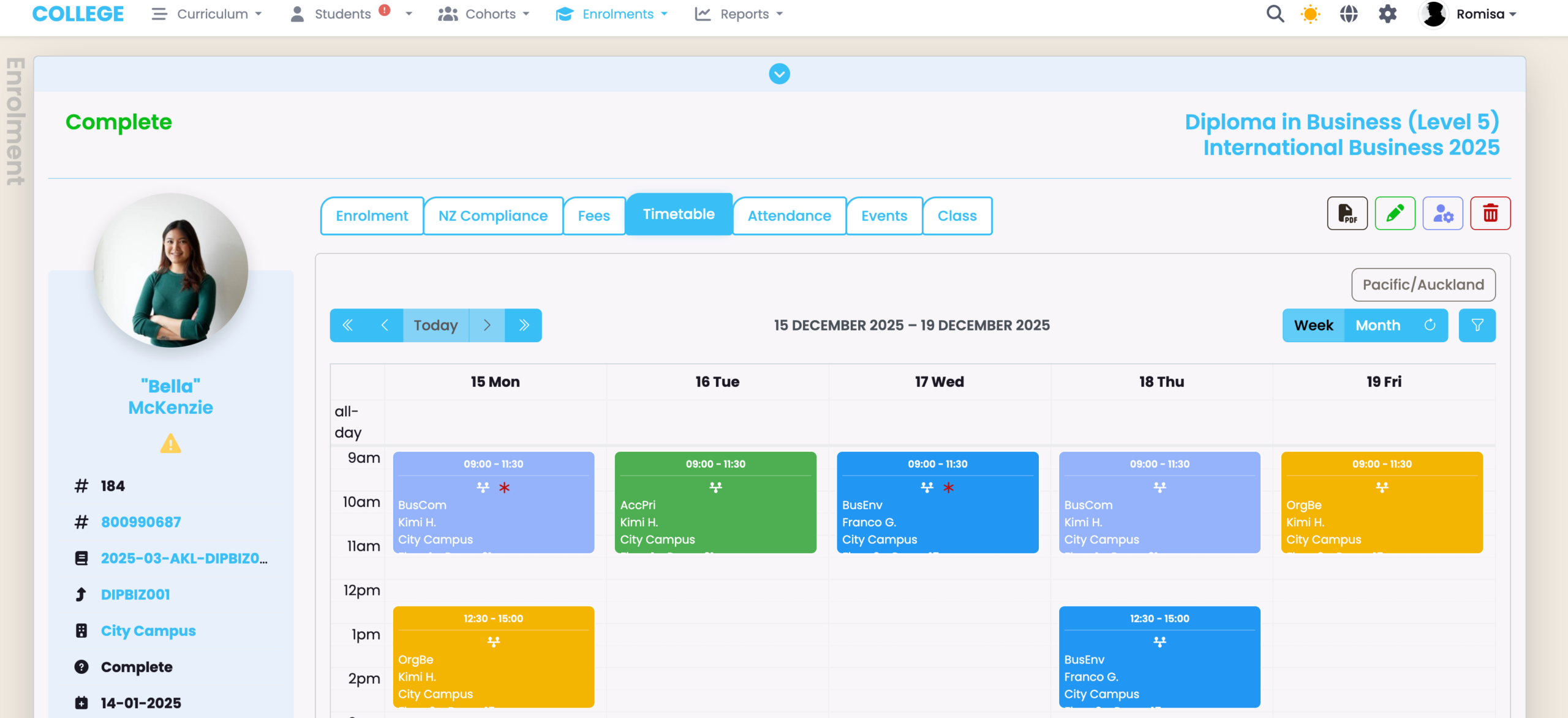 The Student’s timetable will be a combination of all Class, Intake and/or Ad-Hoc Enrolment sessions, if any.