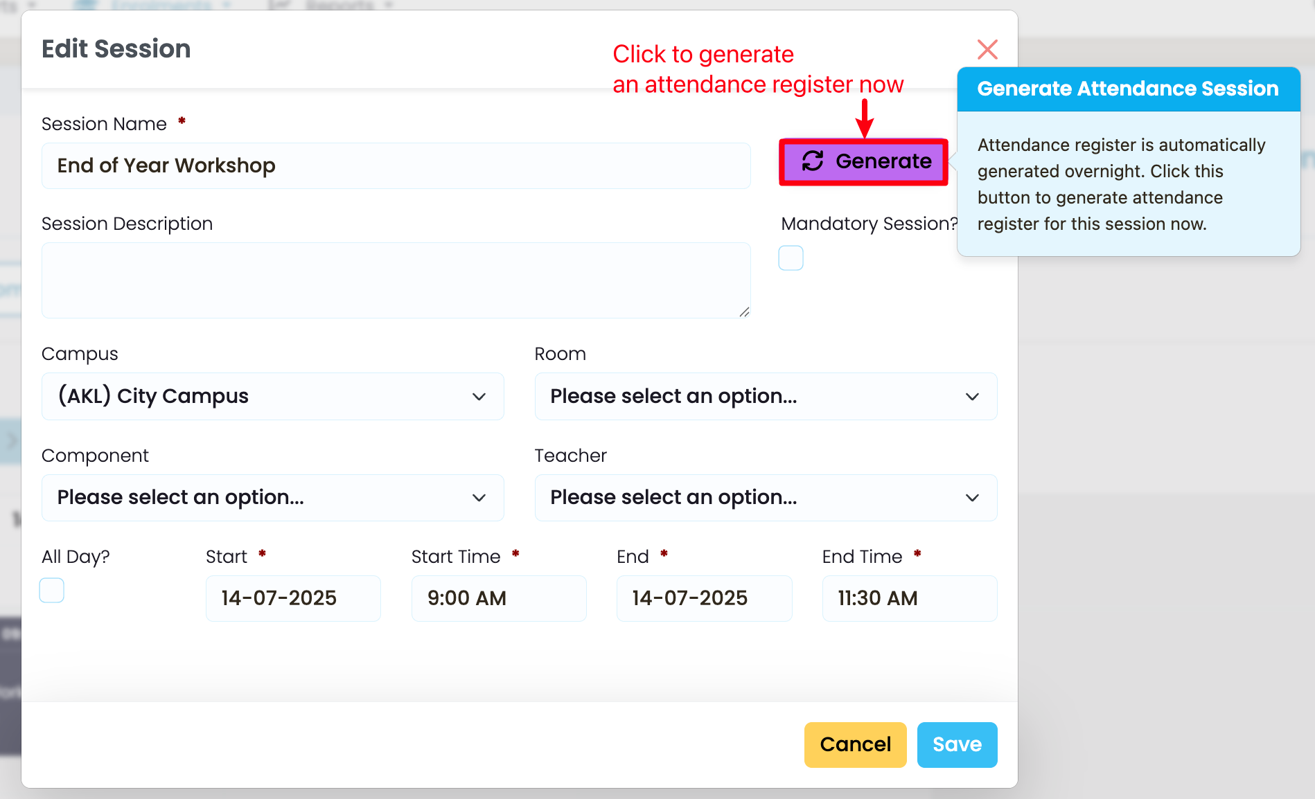 Note: If you create a timetable session and you need to mark attendance on the same day, you can edit the session, and click on the purple “Generate” button to create the attendance register, immediately.