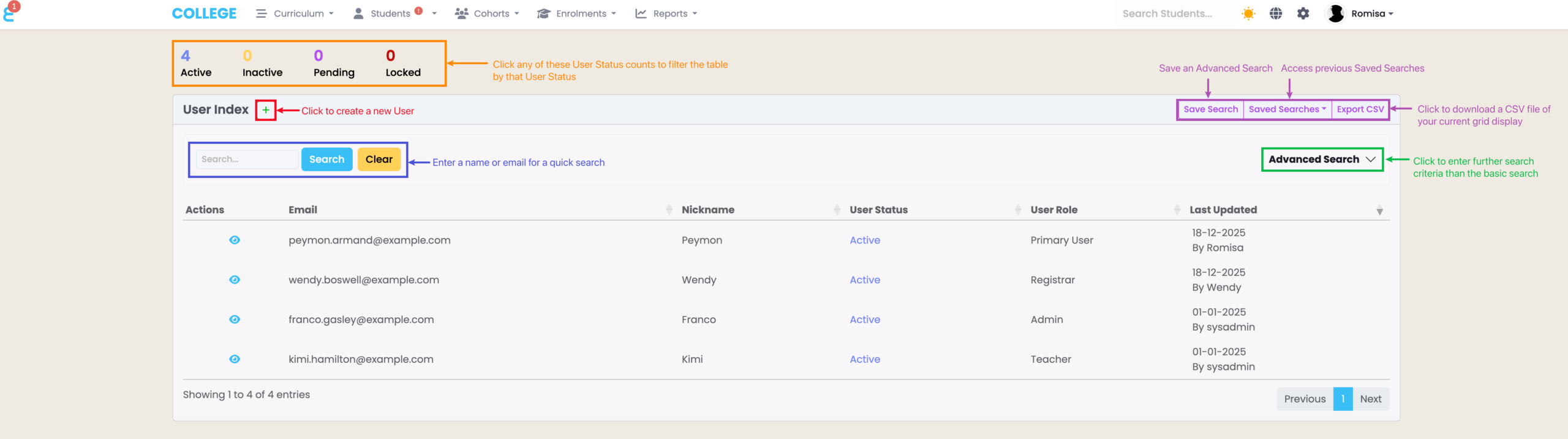 Figure 2. To create a new User, click the green cross icon (red). Filter the User Index by User Status (orange). You can search the list of Users with a quick, basic search (blue), or an Advanced Search with specific search criteria (green), which you can save and access later (purple).