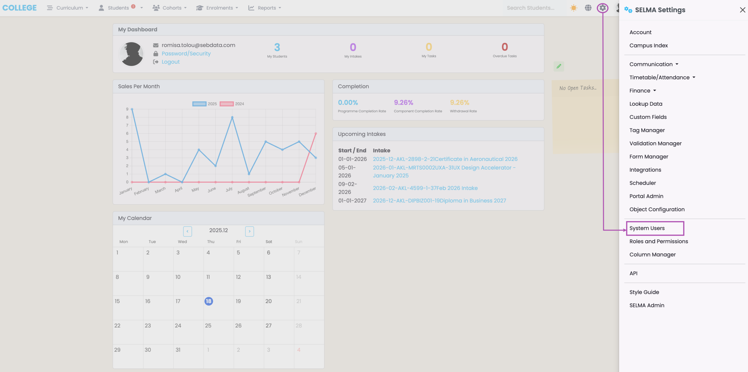 Figure 1. Click the cog icon to open SELMA Settings, and navigate to “System Users” (purple).