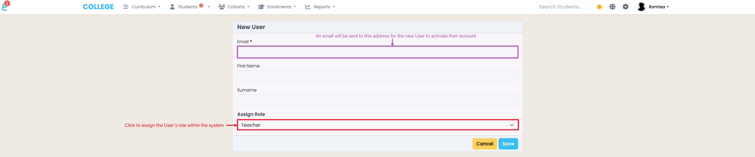 - Fill out the necessary details on the New User form, including the User’s email address, and assign them a Role (Figure 3i-ii.).