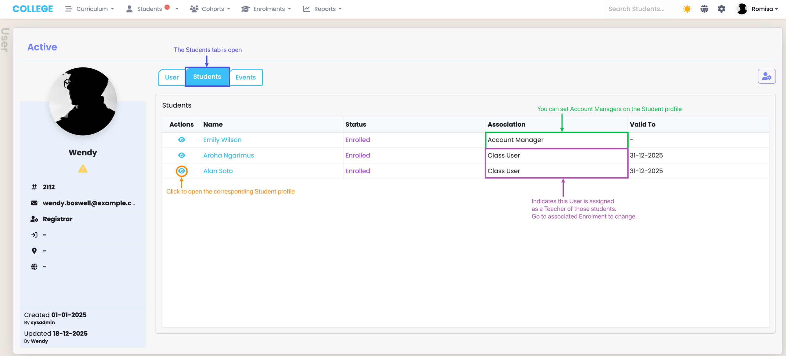 Figure 6i. View which Students this User is associated with. If they are an “Account Manager” they can view and edit a Student profile, or if they are a “Class User” they are a teacher. Click the eye icon beside a Student name (orange) to view their Student profile.