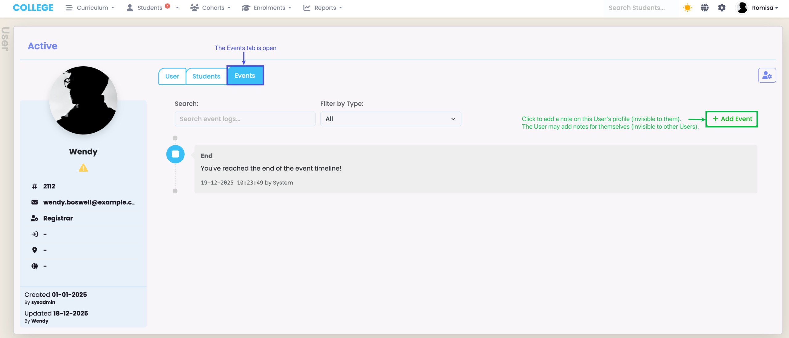 The “Events” tab allows Registrar and Admin level Users to leave notes on a User profile, to communicate between each other.