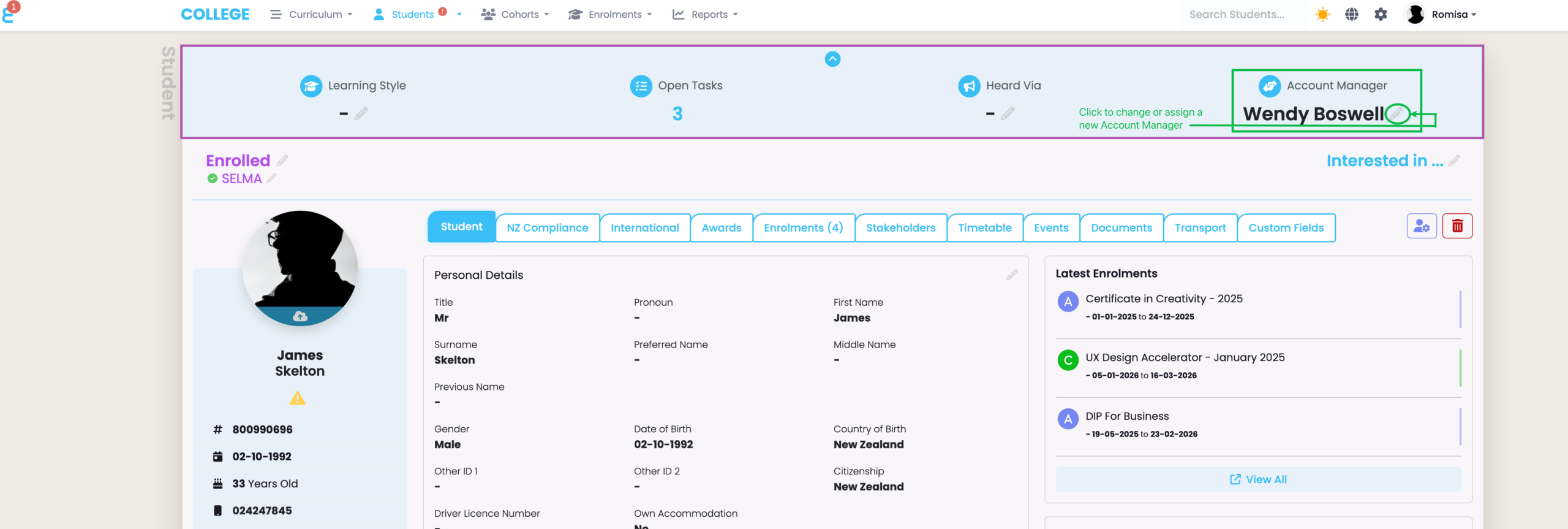 - The User can be assigned an “Account Manager” by accessing the top bar on a Student profile (Figure 6ii.).