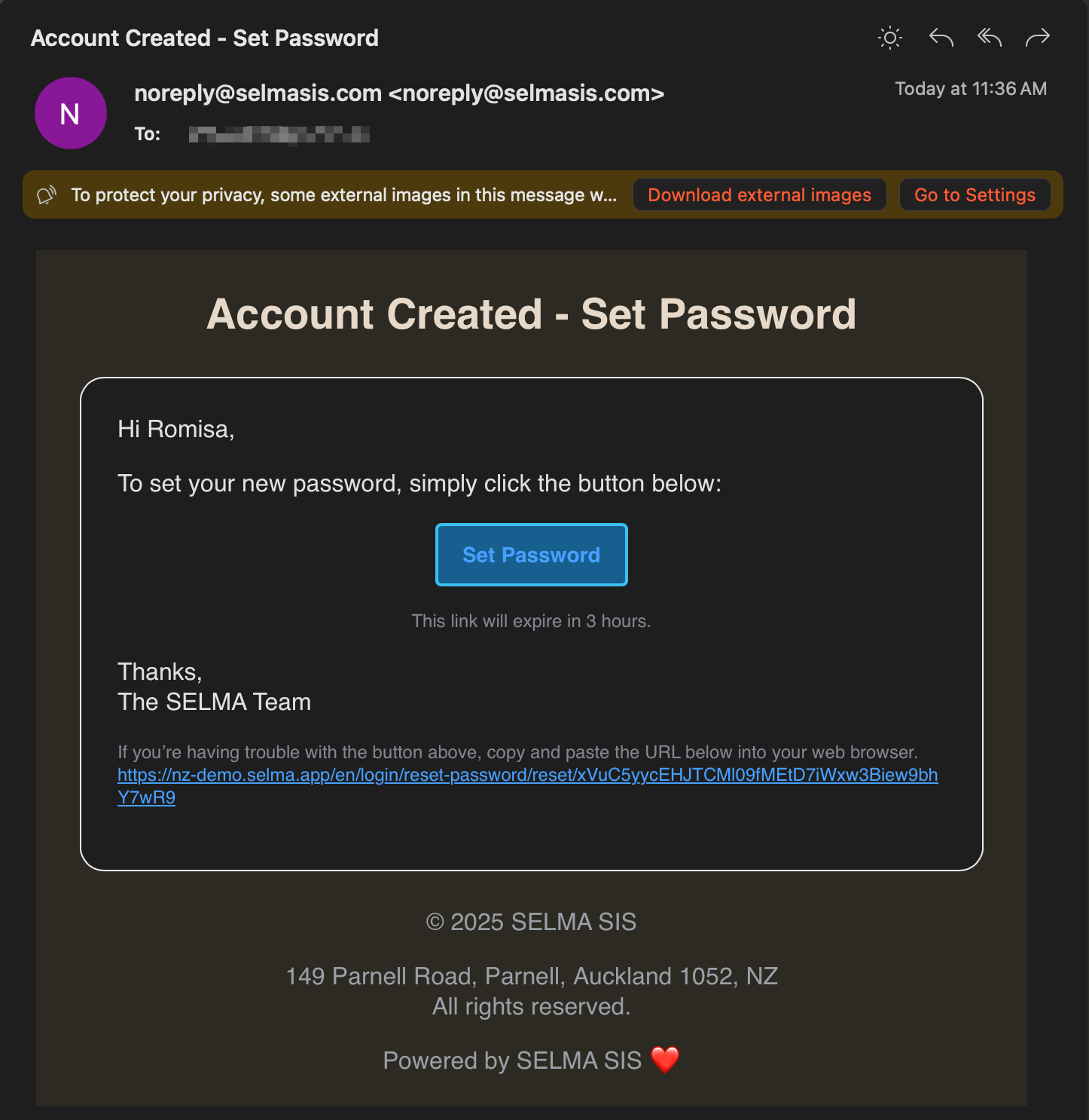 - On submission of the New User form, the email address will be used to send an activation email to the User. They will then need to set-up a password and log-in to SELMA to fully activate their account.