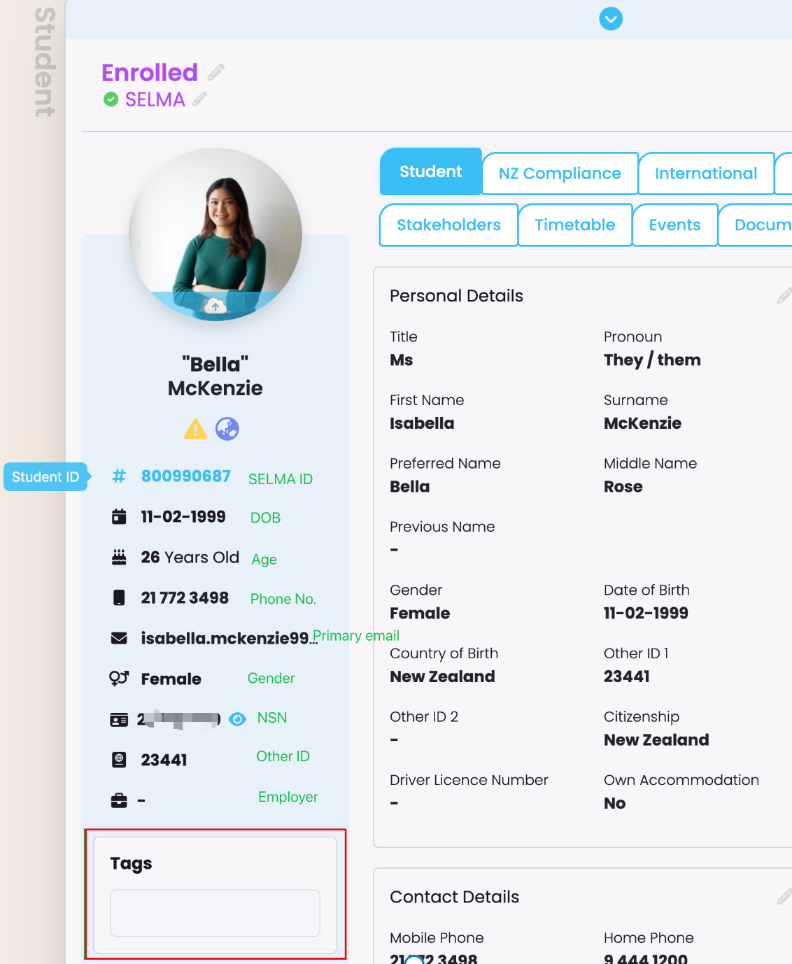 Figure 3. See the left-hand panel annotations for details below the Student profile picture (green text). You can hover over each detail to view their labels as seen for the Student ID (blue tag). The “Tags” field is found at the bottom of the panel (red).