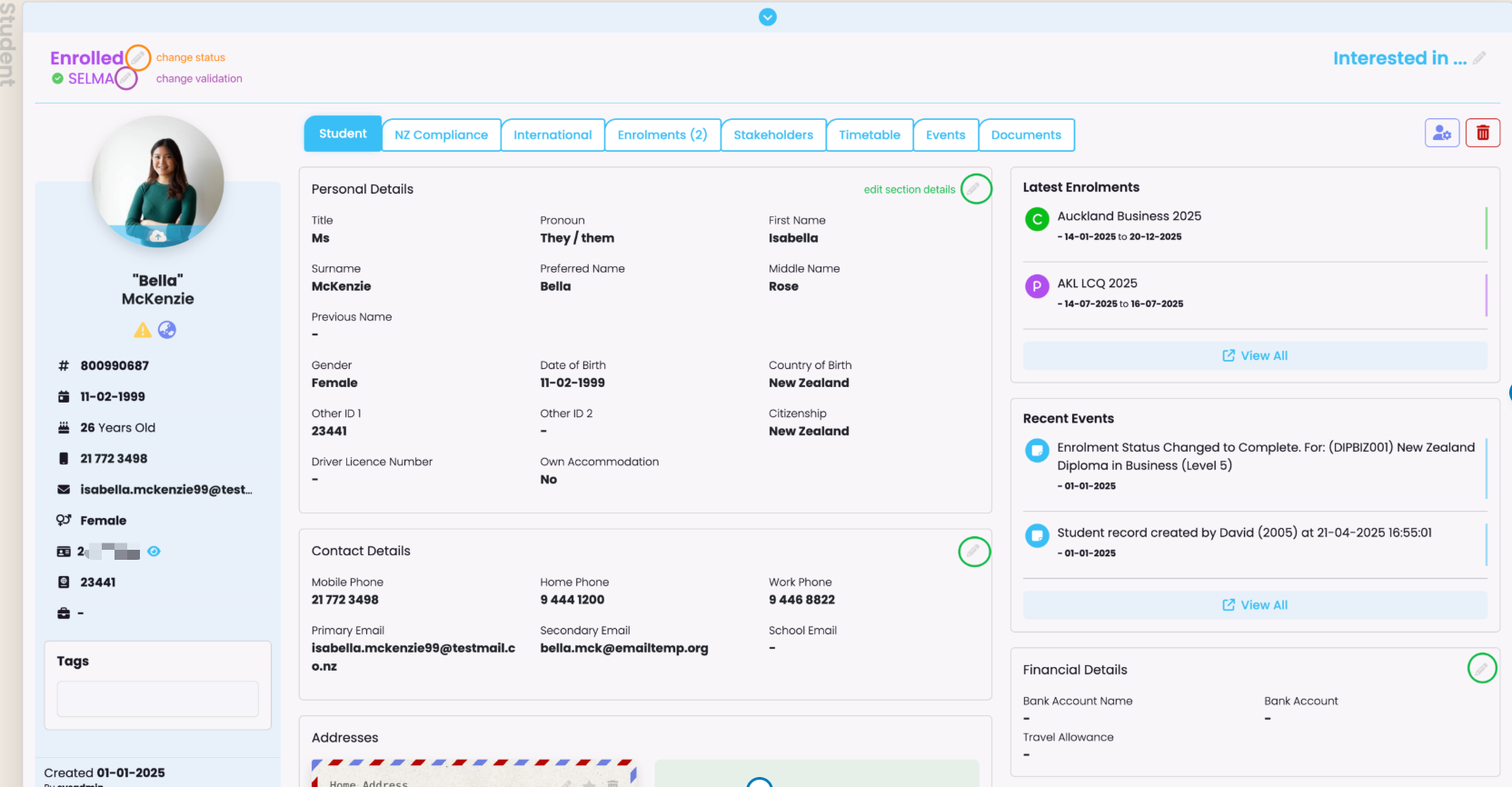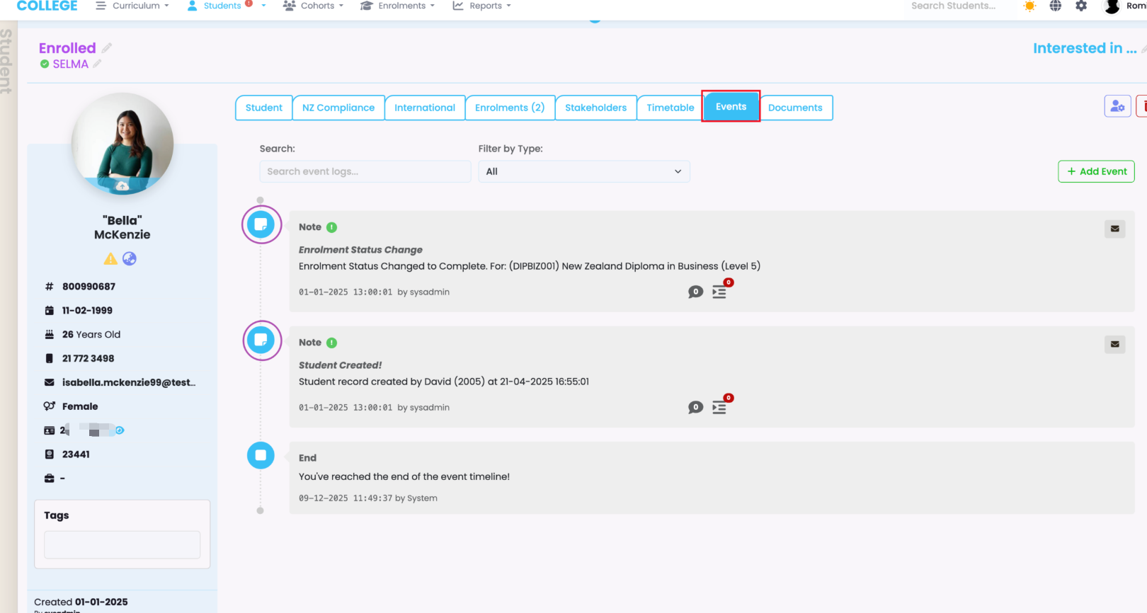 Figure 13. The Events Tab (red) showing Event notifications (purple) such as an Enrolment Status change and Student record creation.