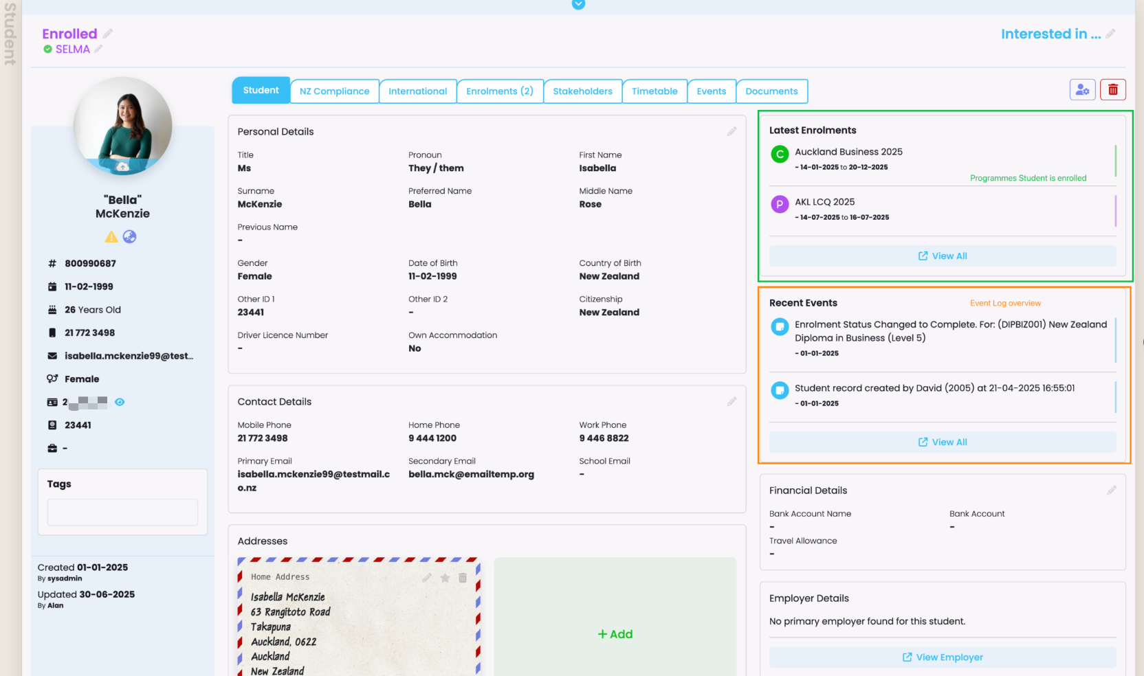 Figure 6. See which Programmes the Student is enrolled into (green), and recent Events associated with their account (orange).