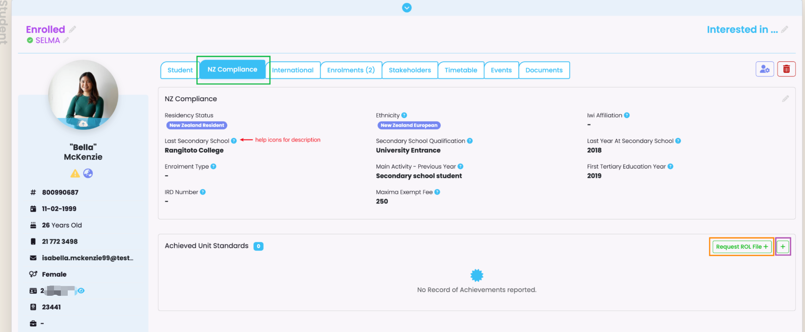Figure 8i. The NZ Compliance tab (green) showing relevant information fields to edit, and the options to request a RoL file (orange) or to add Unit Standards manually (purple).