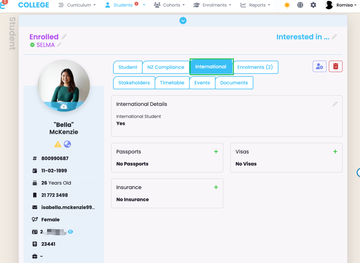 For International Students, you can add their Passport, Insurance and Visa/s details (Figure 9.).