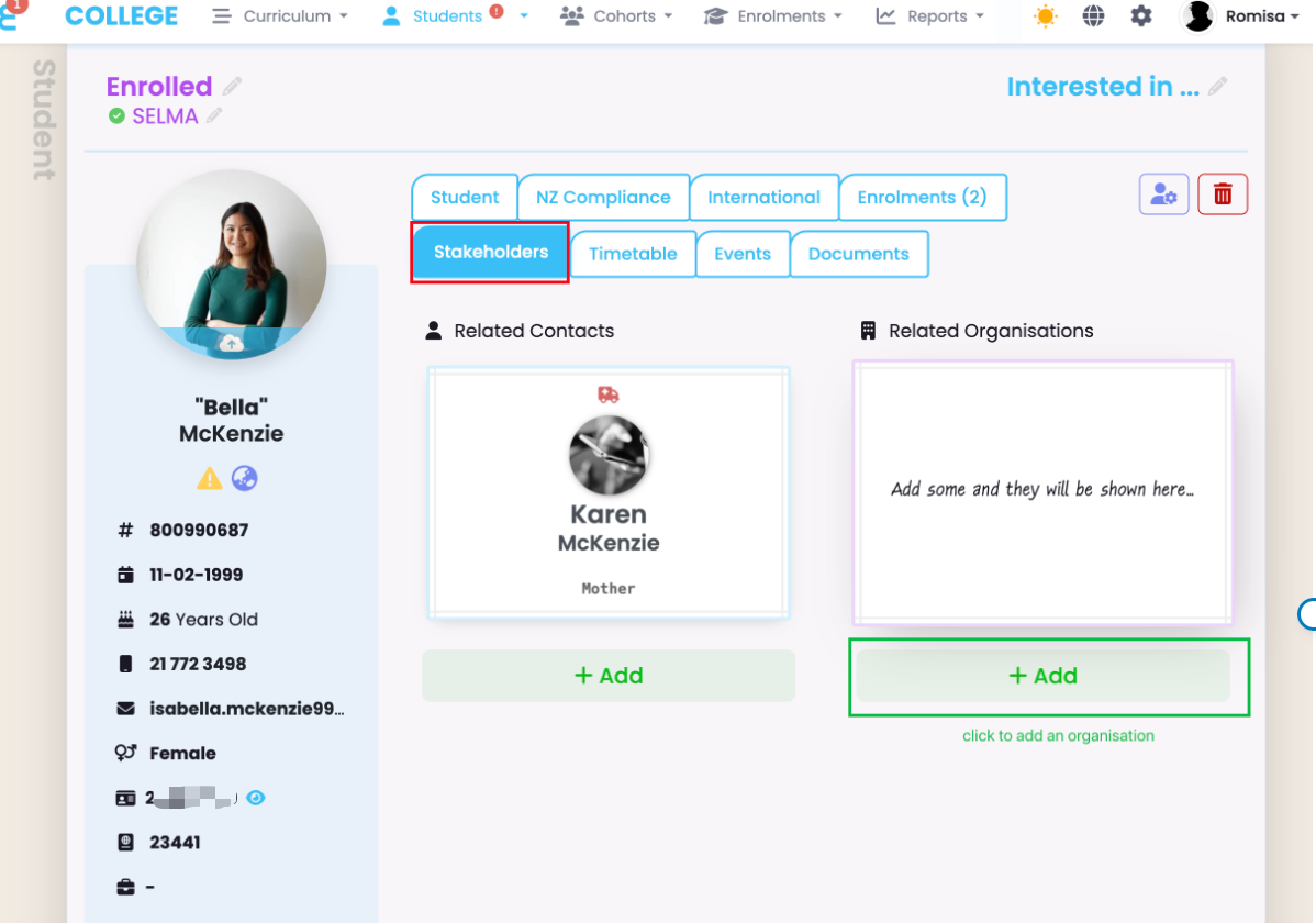 If the Student has Contacts or Organisations related to them, add their details and opt to include them in communications (Figure 11i-ii.).