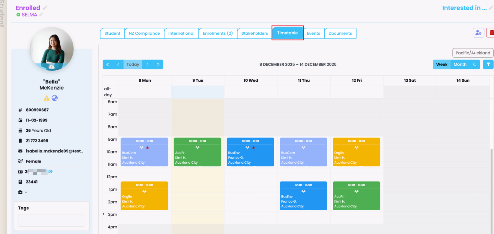 In the Timetable Tab, you can view current and future Component sessions for a Student (Figure 12.).