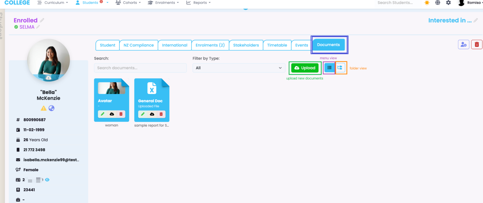 Figure 14i. The Documents tab (blue) shows the “Upload” button (green) and the buttons to change between views. The current view is the menu view (purple), while the folder view is next to it (orange).