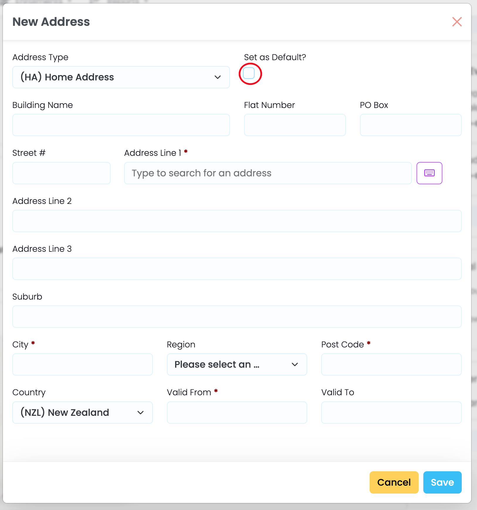 IMPORTANT NOTE: For NZ compliance, NZQA requires an address. In SELMA, you MUST set one of the addresses as the default so the system can fetch the address for NZQA reporting (Figure 5.).