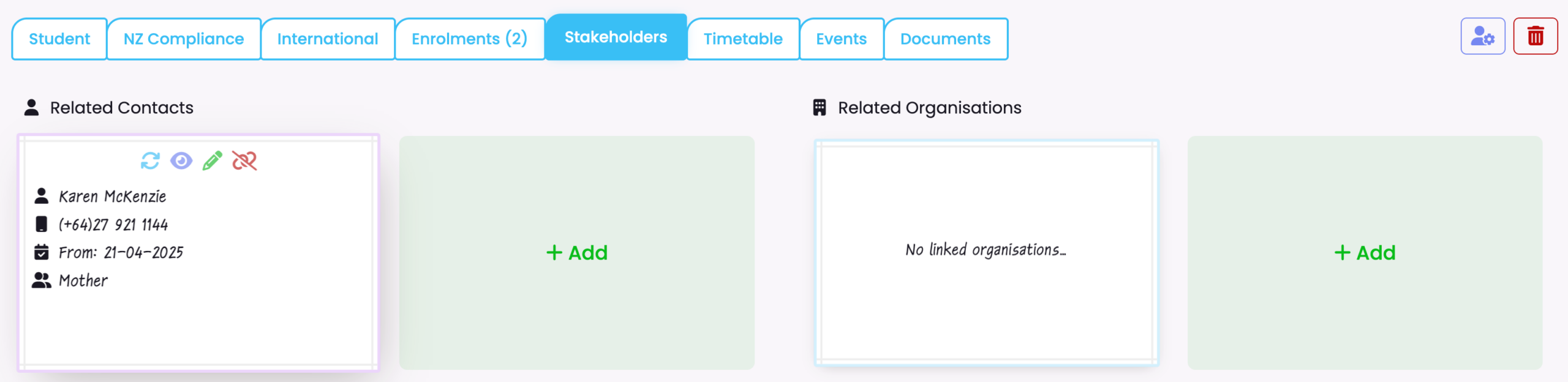 Figure 11iii. A flipped Contact card on the left shows options to view (eye icon), edit (green pencil icon) and unlink the Contact (red chain link icon) from the student profile.