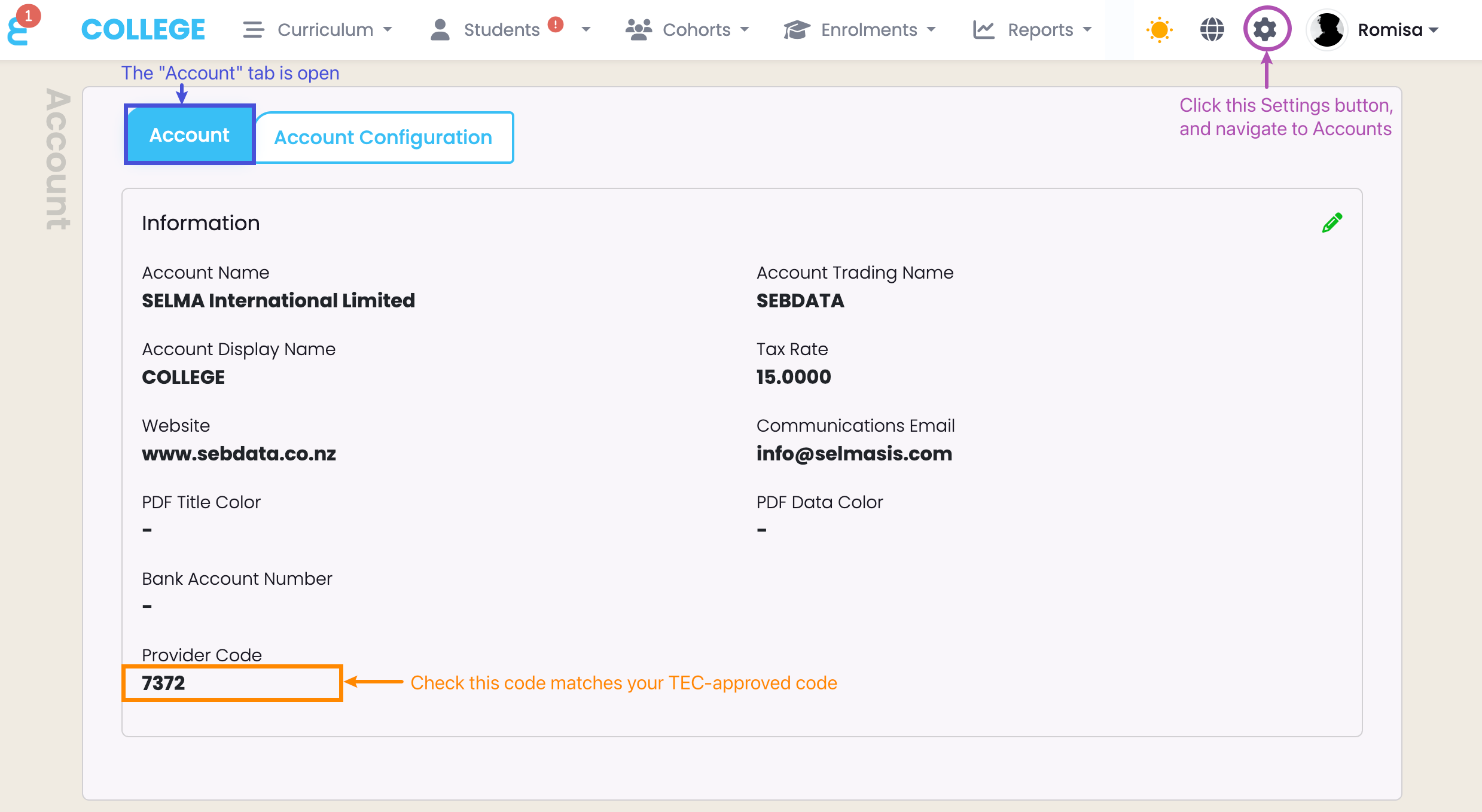 - Navigate from Settings > Accounts, and check that the “Provider Code” is correct (Figure 2.).