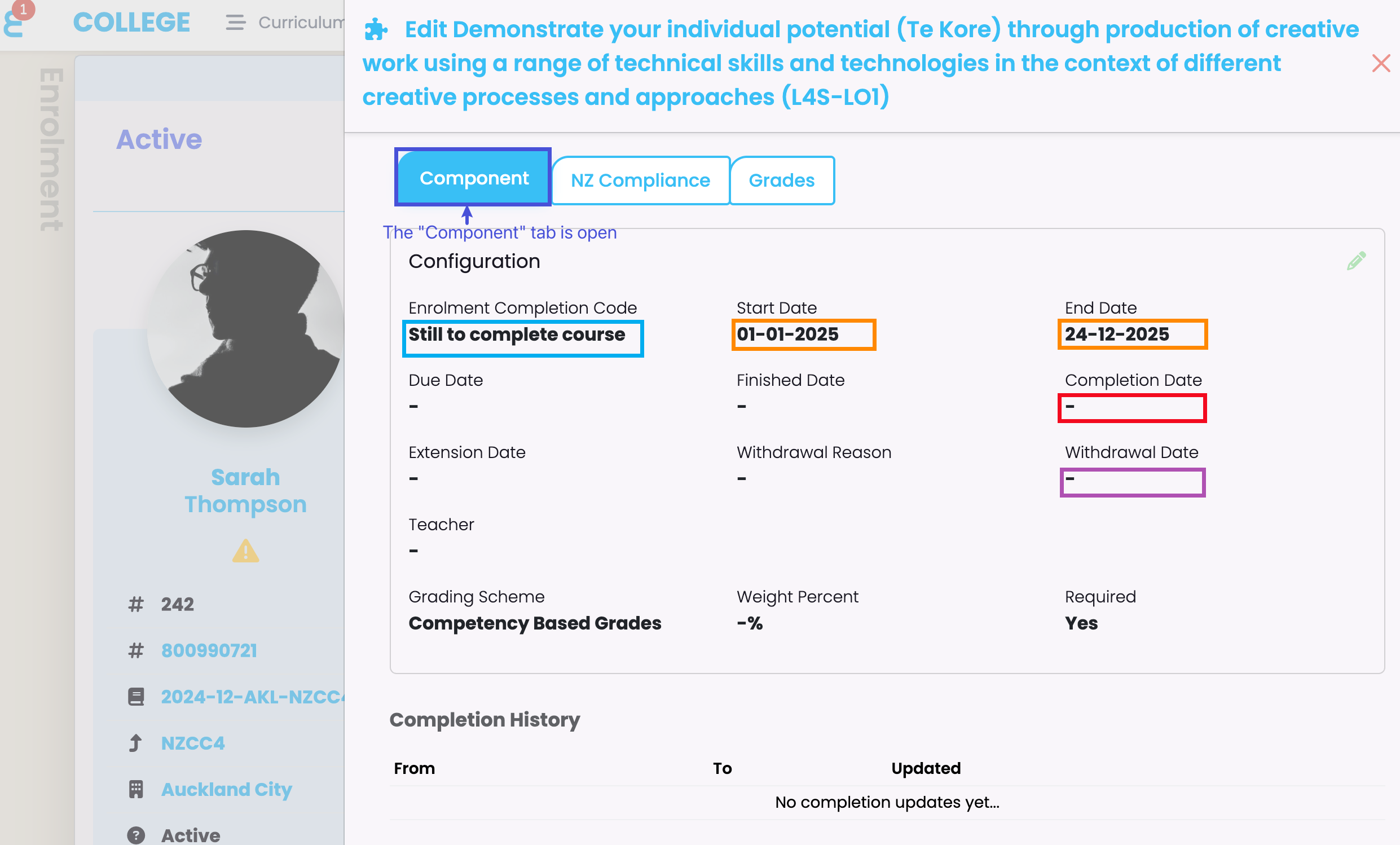 Figure 6ii. Completion codes are stated again, here (light blue). Check that the “Start” and “End” dates (orange) of an Enrolment Component fall within or outside the SDR extraction period, and the Completion Date (red) and Withdrawal Date (purple) within the SDR extraction period.