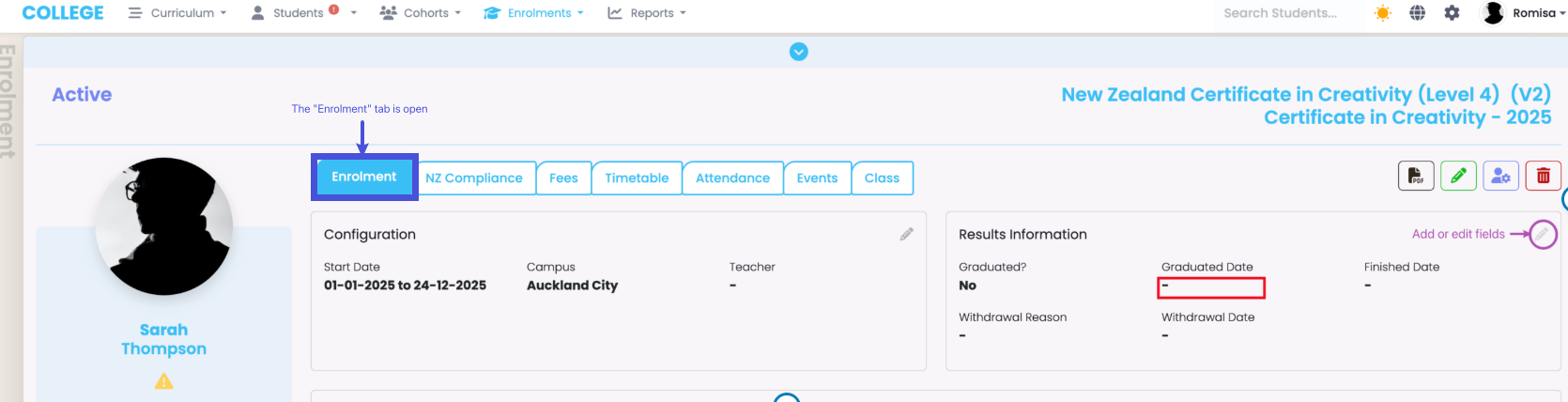 Figure 7. The “Graduated Date” (red) can be found on the “Enrolment” tab (blue). Click the pencil icon to add or edit a field (purple).