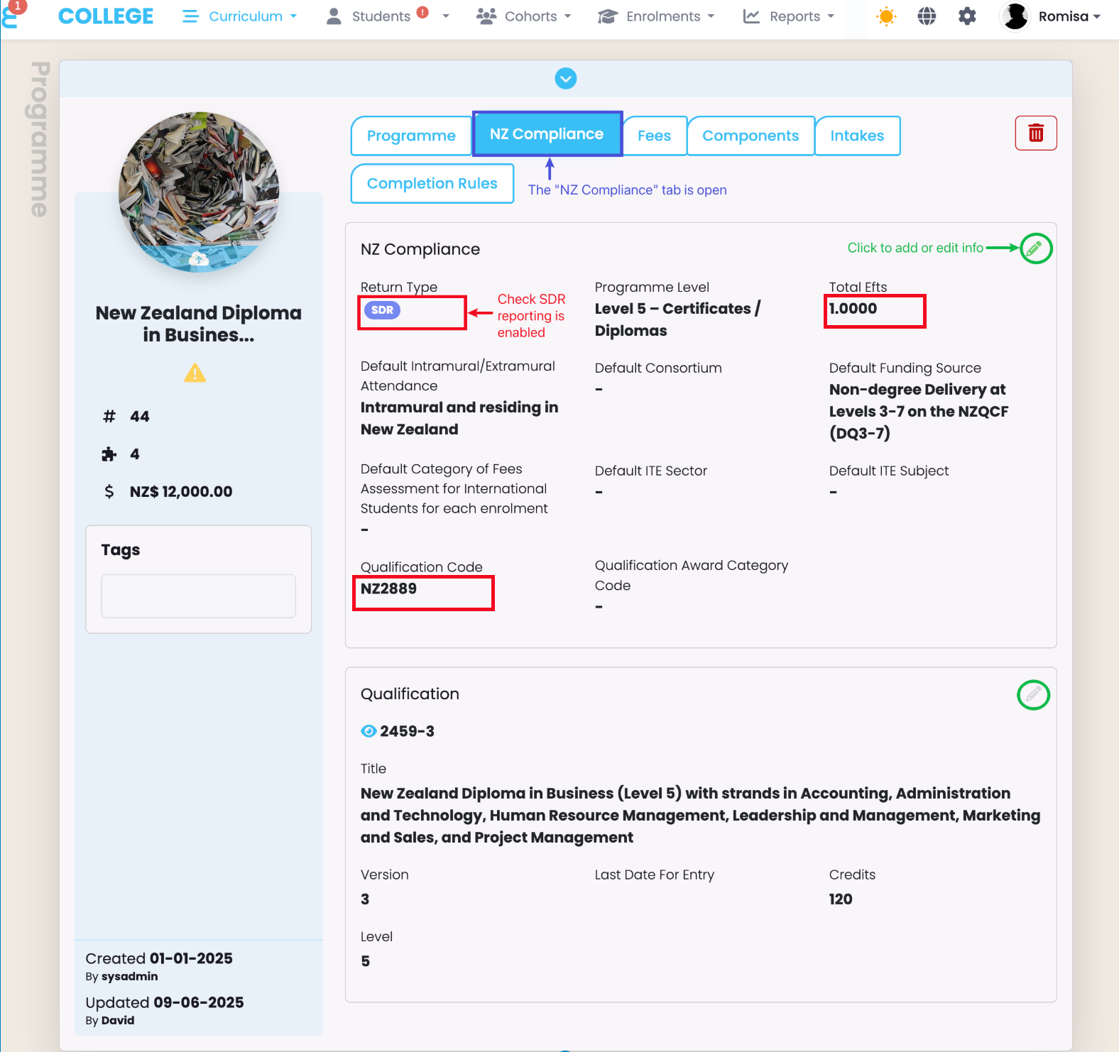 To upload Programme details in the SDR report, navigate from the Curriculum Index to a Programme. Then, in the Programme’s NZ Compliance tab, set the “Return Type” as “SDR” and fill the remaining fields with your provider’s unique Programme information (Figure 8.).