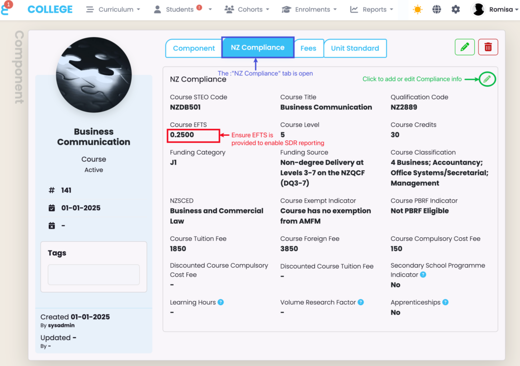To upload course details in the SDR report, navigate from the Curriculum Index to a Component. Then, in the Component’s NZ Compliance tab, provide the “Course EFTS” to include it in the SDR report, and fill the remaining fields with your provider’s unique Course information (Figure 9.).