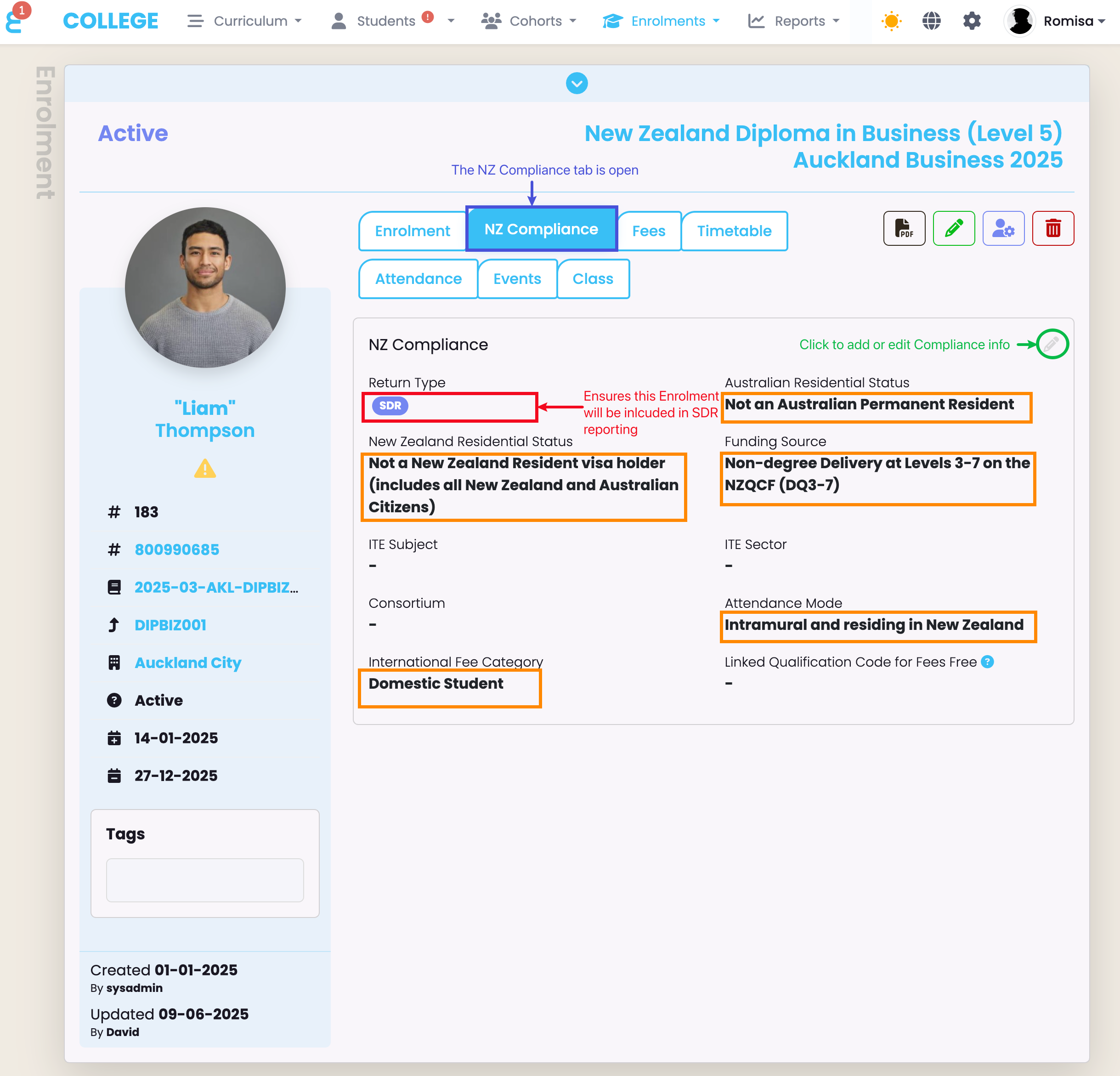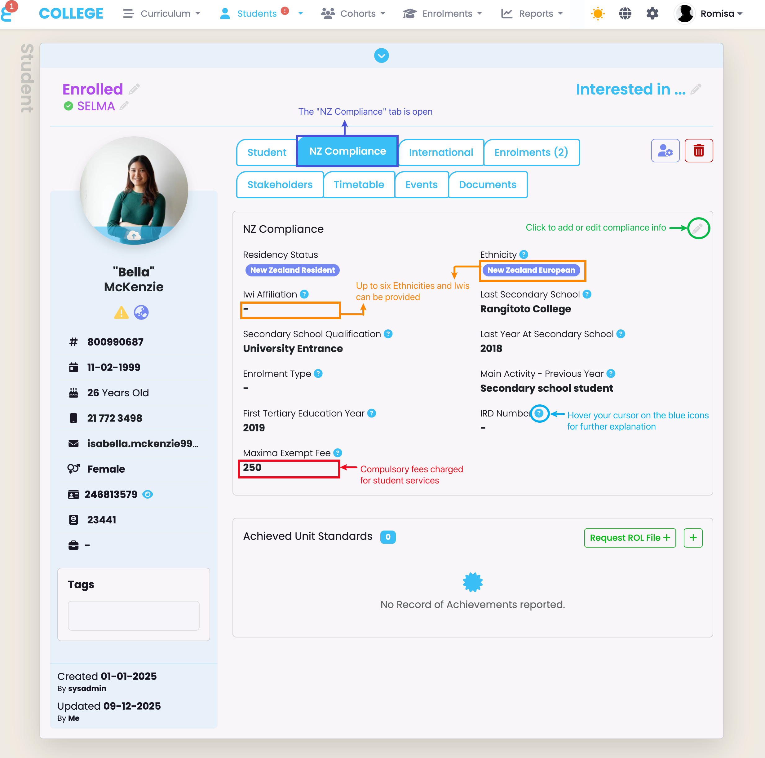 To upload Student details in the SDR report, navigate from the Student Index to a Student profile. Then, in the Student’s NZ Compliance tab, fill all fields with their relevant information.