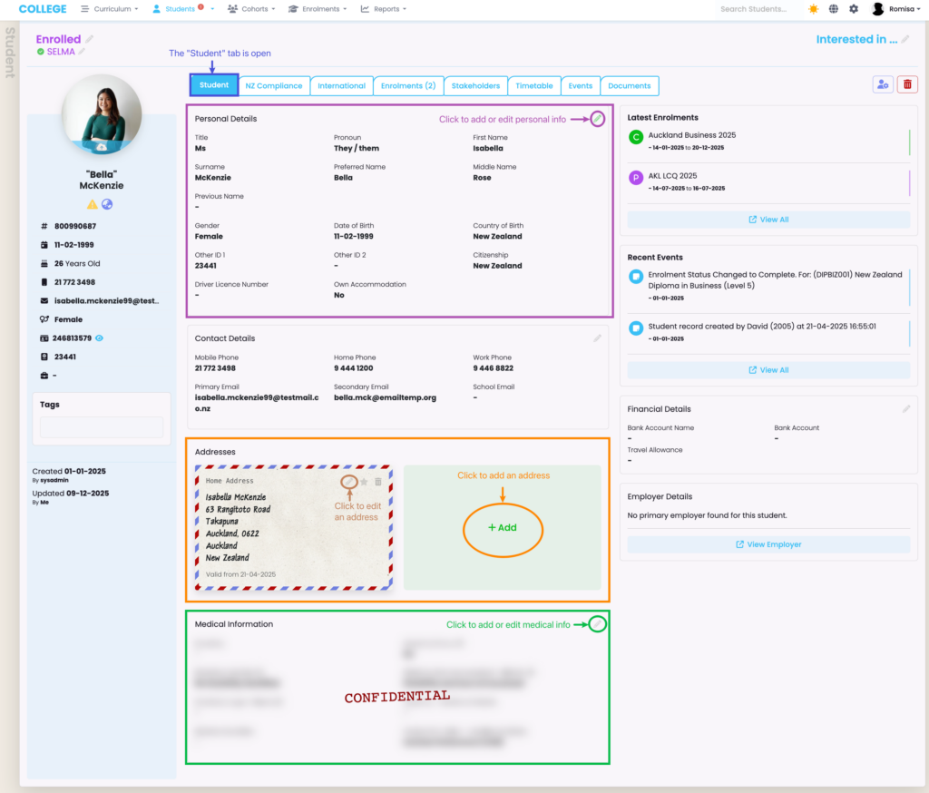 Figure 11. The “Student” tab includes some information which will be included in an SDR report, including “Personal Details” (purple), “Addresses” (orange) and “Medical Information” (green). Click the associated icons in the screenshot below, to add and/or edit details.