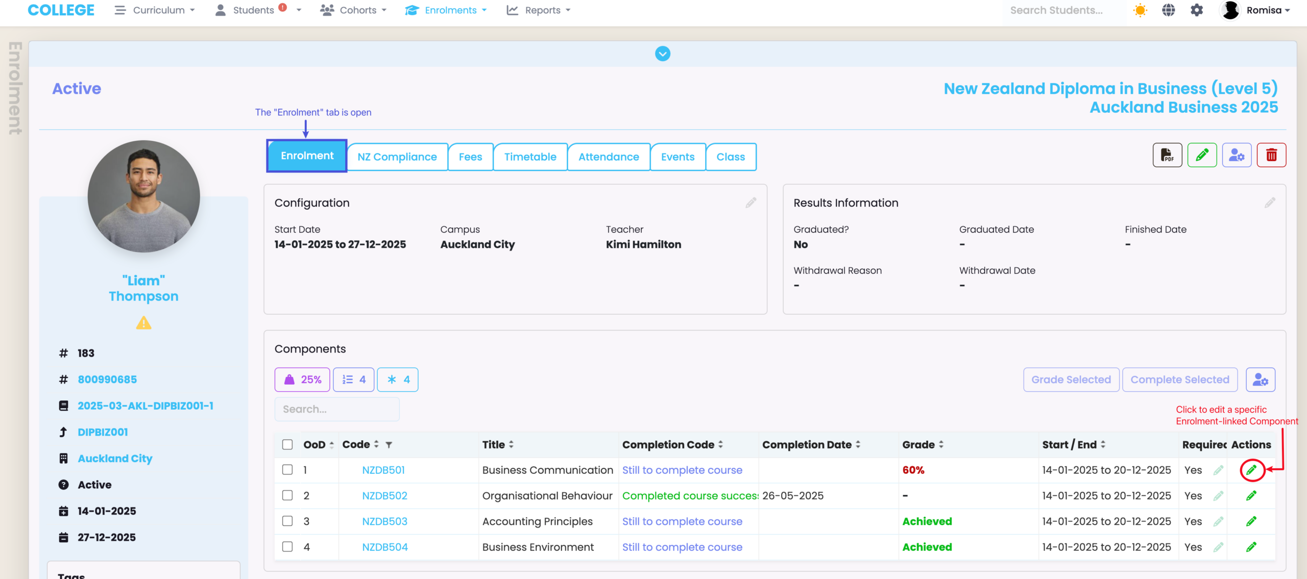 If you wish to edit some of the Compliance details of a specific Enrolment, make adjustments to the Components linked to the Enrolment from the “Enrolment” tab (Figure 13i-ii.).