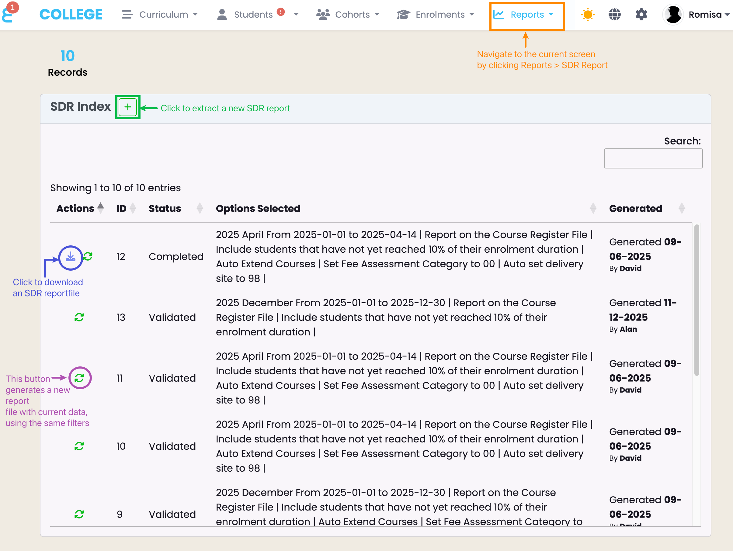 Figure 14. View a list of previous SDR extractions, or rerun and download them. Click the cross button (green) to generate a new report file with new filters.