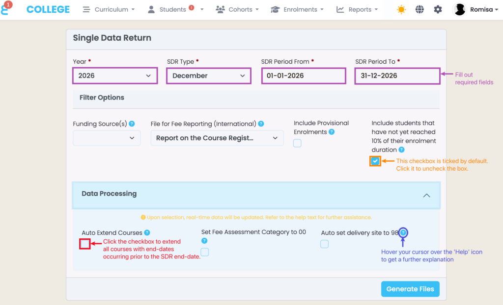 - Avoid SDR errors by choosing to “Auto Extend (all) Courses”, if you know some or all of your courses have end dates prior to the SDR Period end date (Figure 15.).