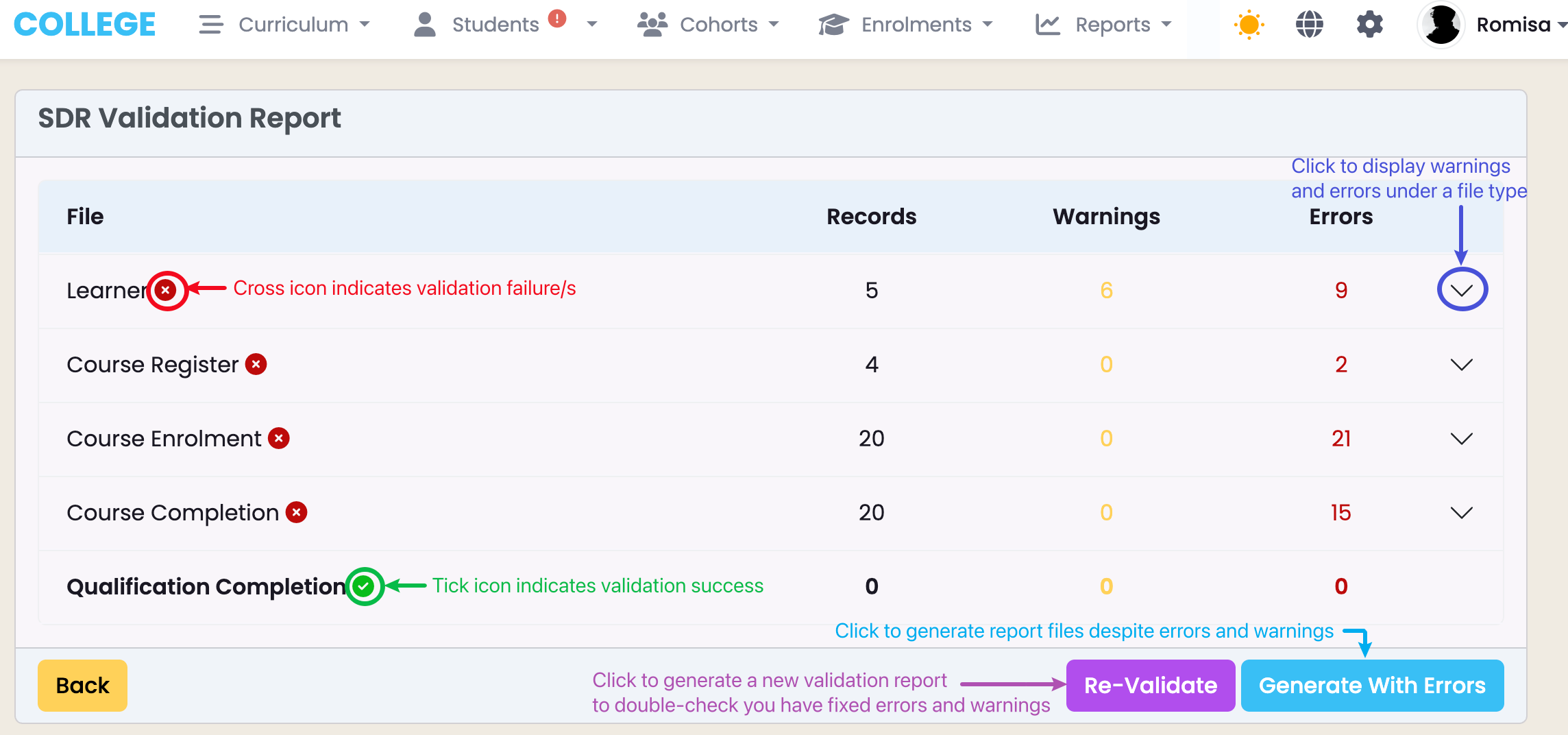 Figure 16i. The Validation Report is generated before generating a final SDR report. Click the drop-down arrow to read where and why warnings and errors are occurring, and how to resolve them (dark blue). Once you have resolved any issues, we recommend clicking the purple “Re-Validate” button to double-check that your final report will be error-free.