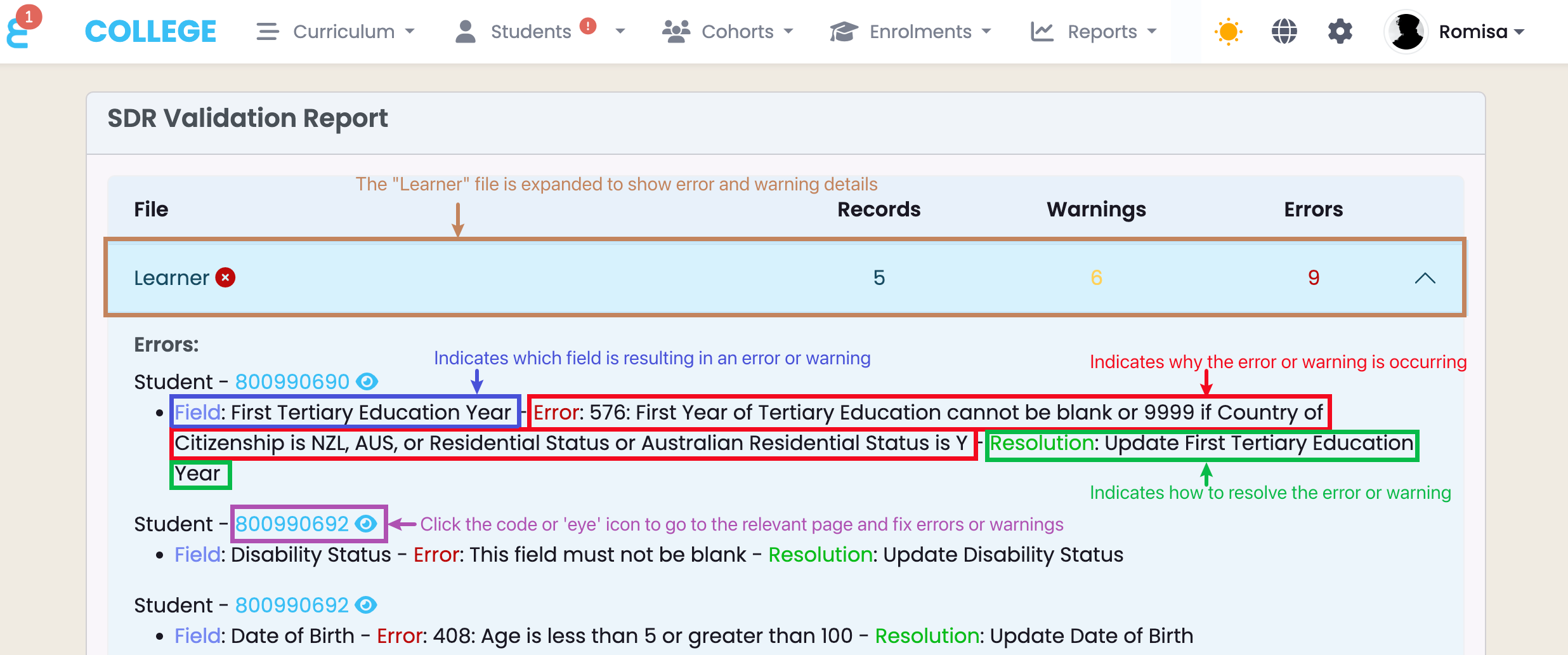 Figure 16ii. Please take a note of where and why an error or warning is occurring (blue, red) and how to resolve it (green), before clicking to be directed to the corresponding page to fix the issue/s (purple).