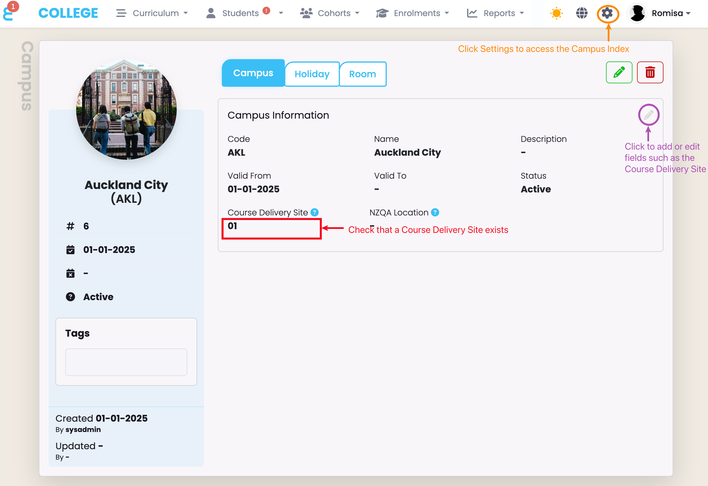 Figure 3. Check (red) and edit the “Course Delivery Site” (purple), to ensure an Enrolment is eligible for SDR reporting.