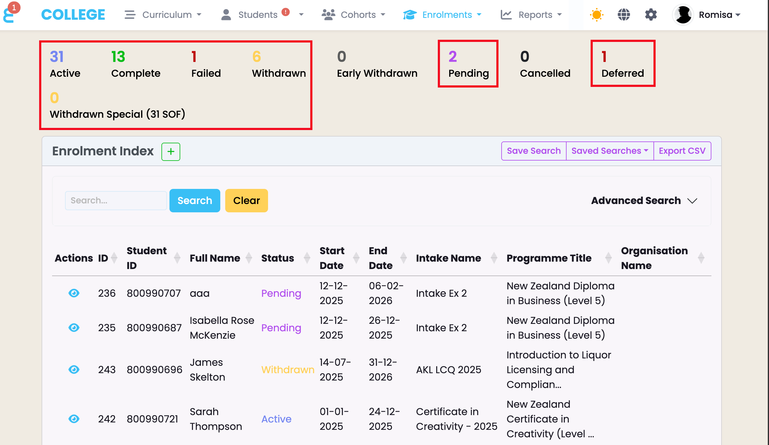 Figure 5. Check (red) and edit the “Return Type” field (purple), to ensure an Enrolment is eligible for SDR reporting.