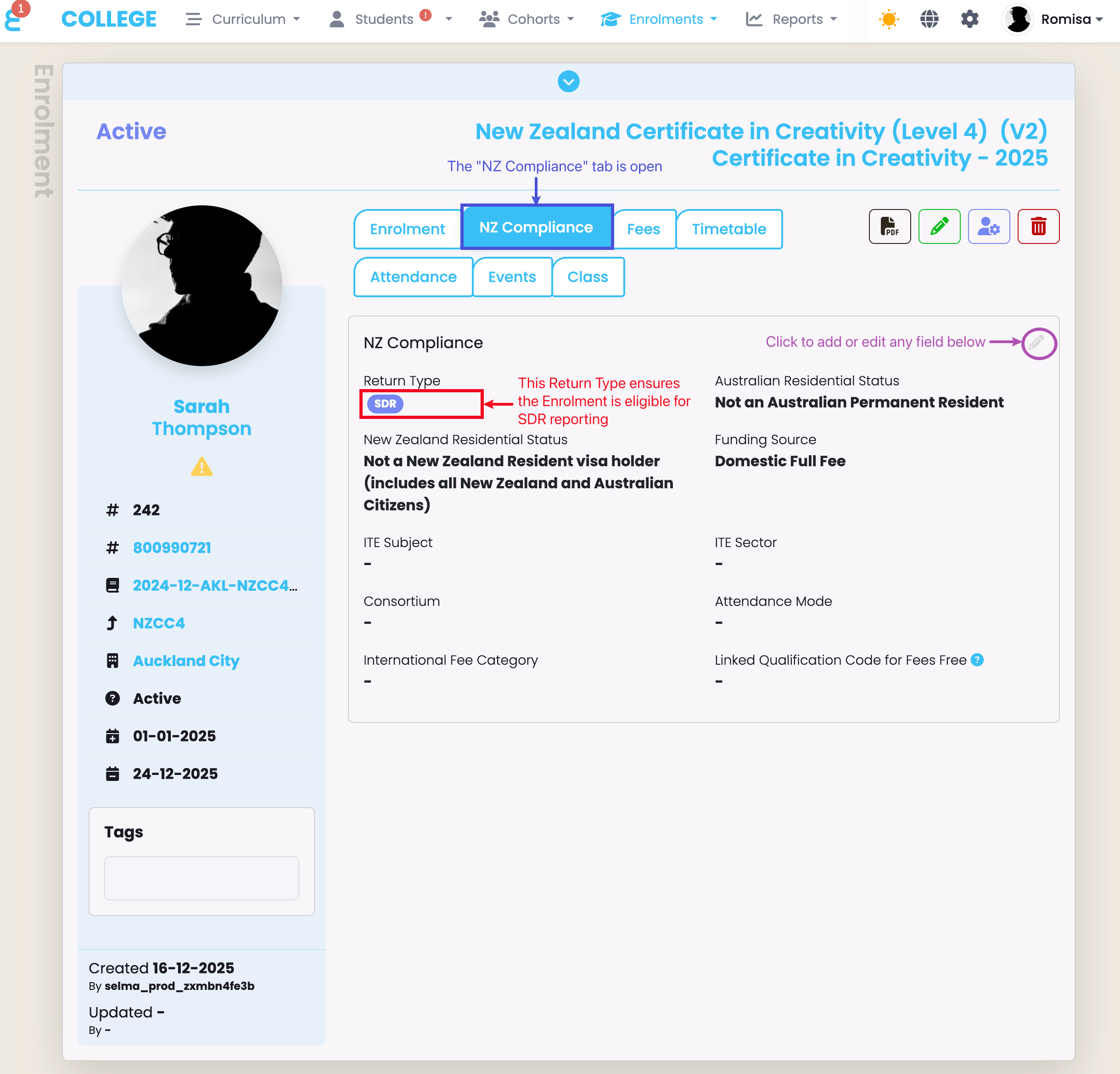 To upload Enrolment details in the SDR report, navigate from the Enrolment Index to an Enrolment. Then, in the Enrolment’s NZ Compliance tab, set the “Return Type” as “SDR“.