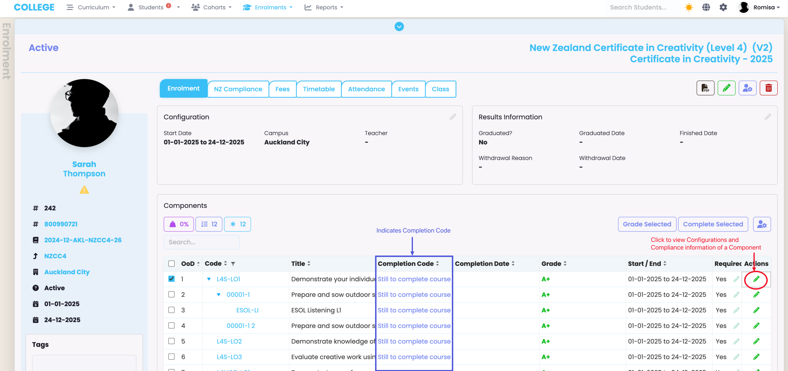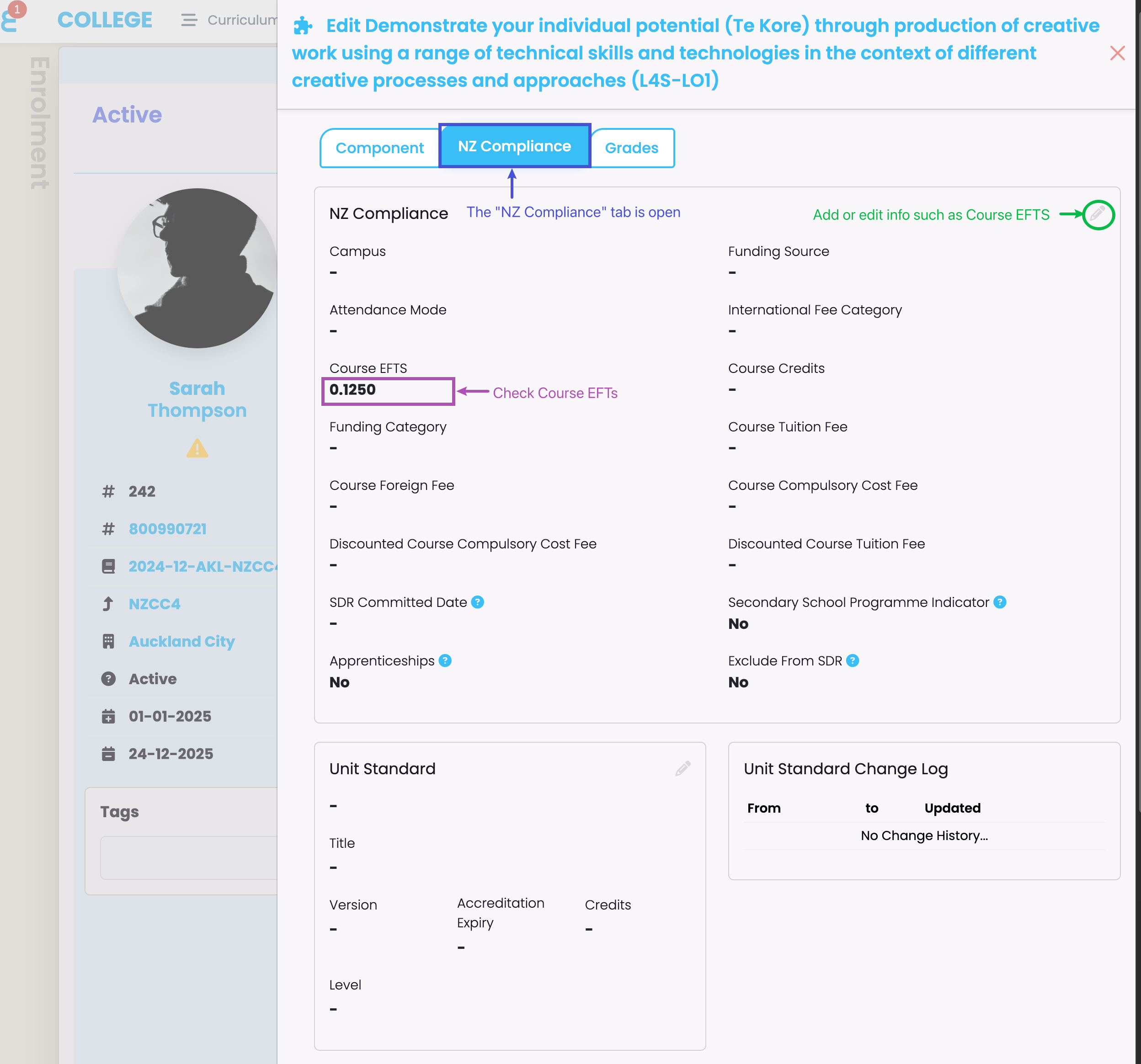 Figure 13i. To edit Compliance information for a Component linked to a select Enrolment, click the pencil icon (red).