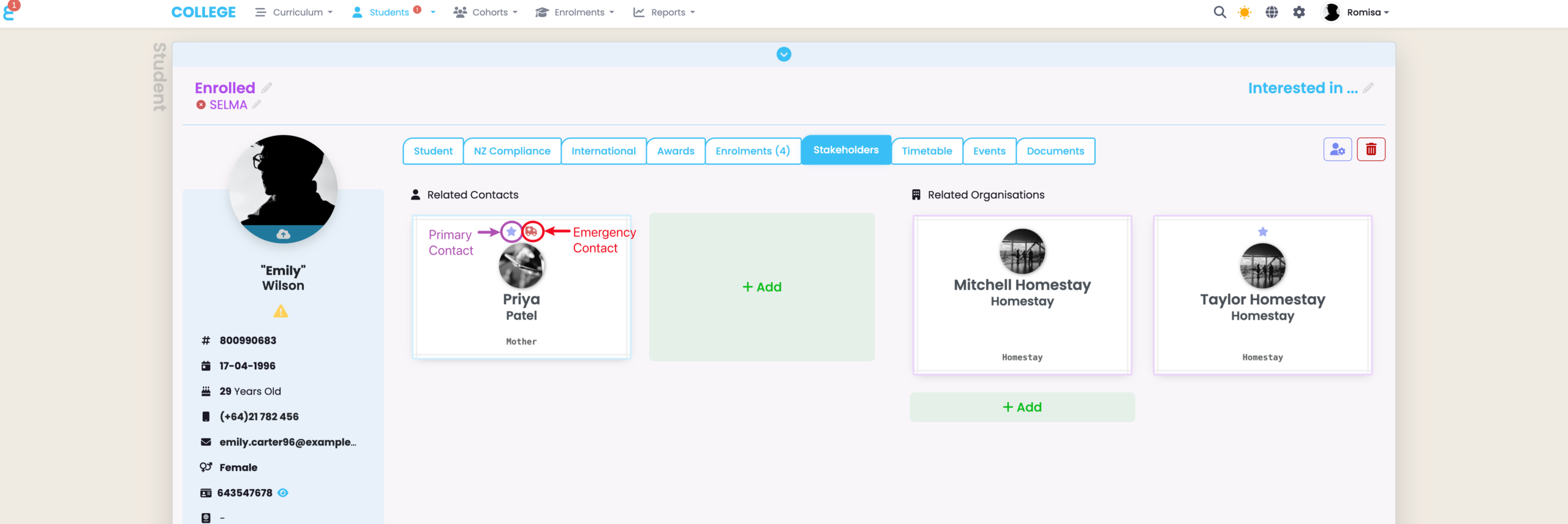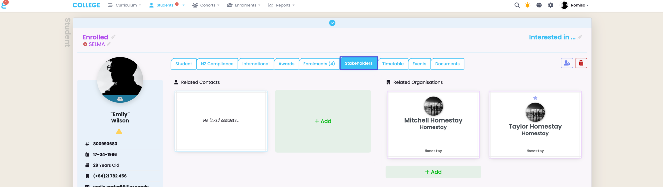 On the Student profile, go to the “Stakeholders” tab. You’ll see two groups: Related Contacts and Related Organisations.