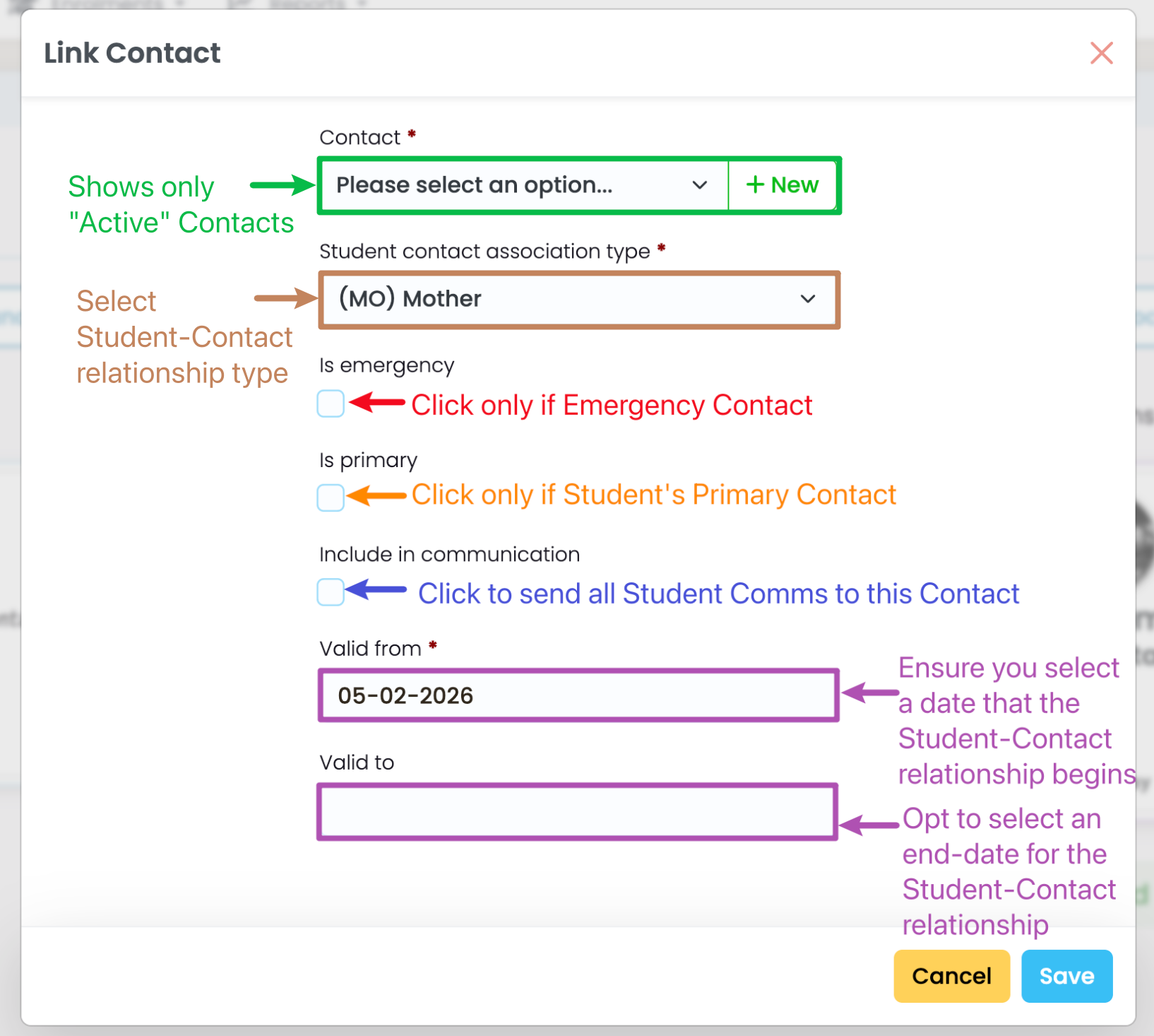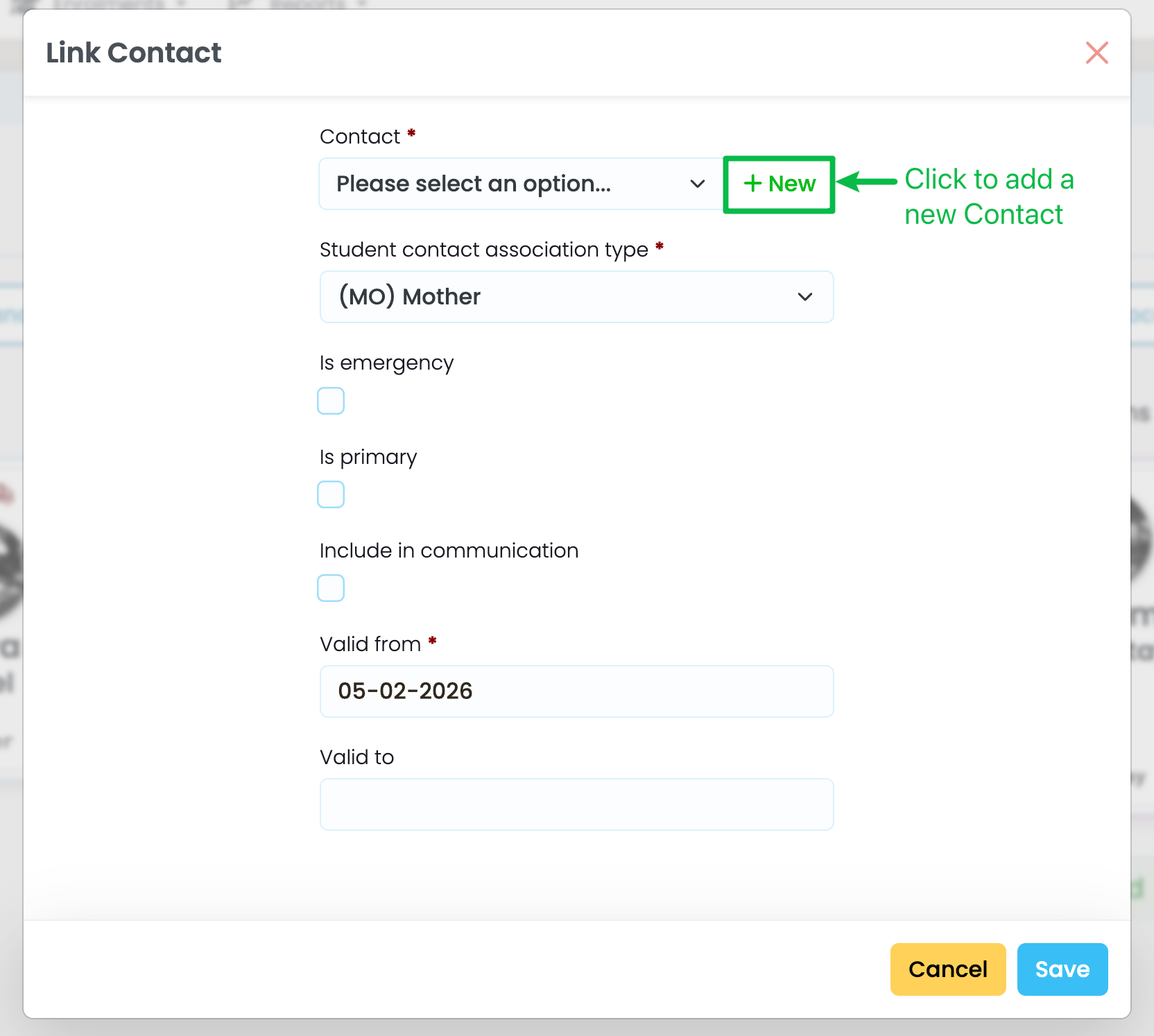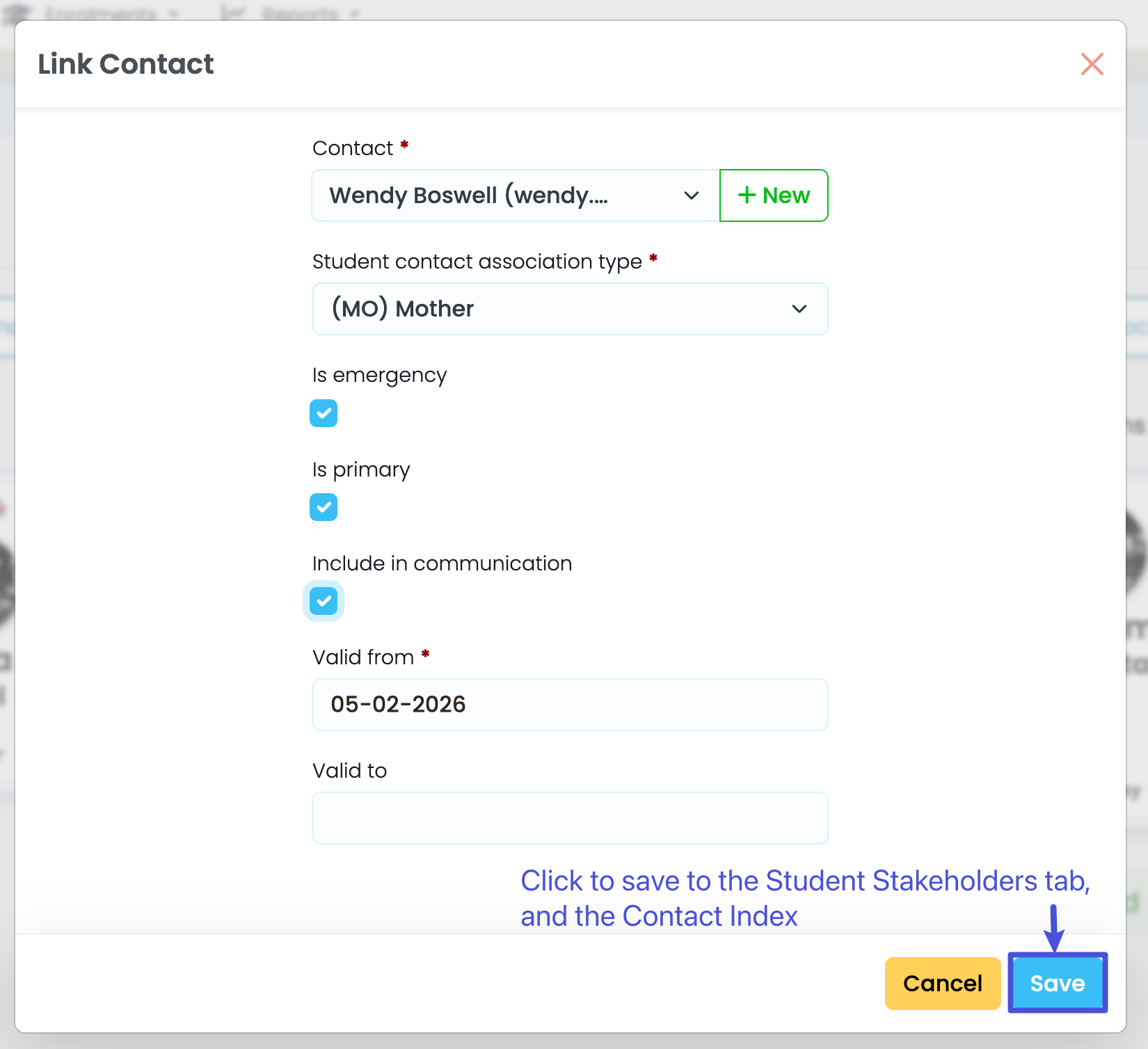 - Create a new Contact from the Contact Index, then link them via the Student’s Stakeholders tab.