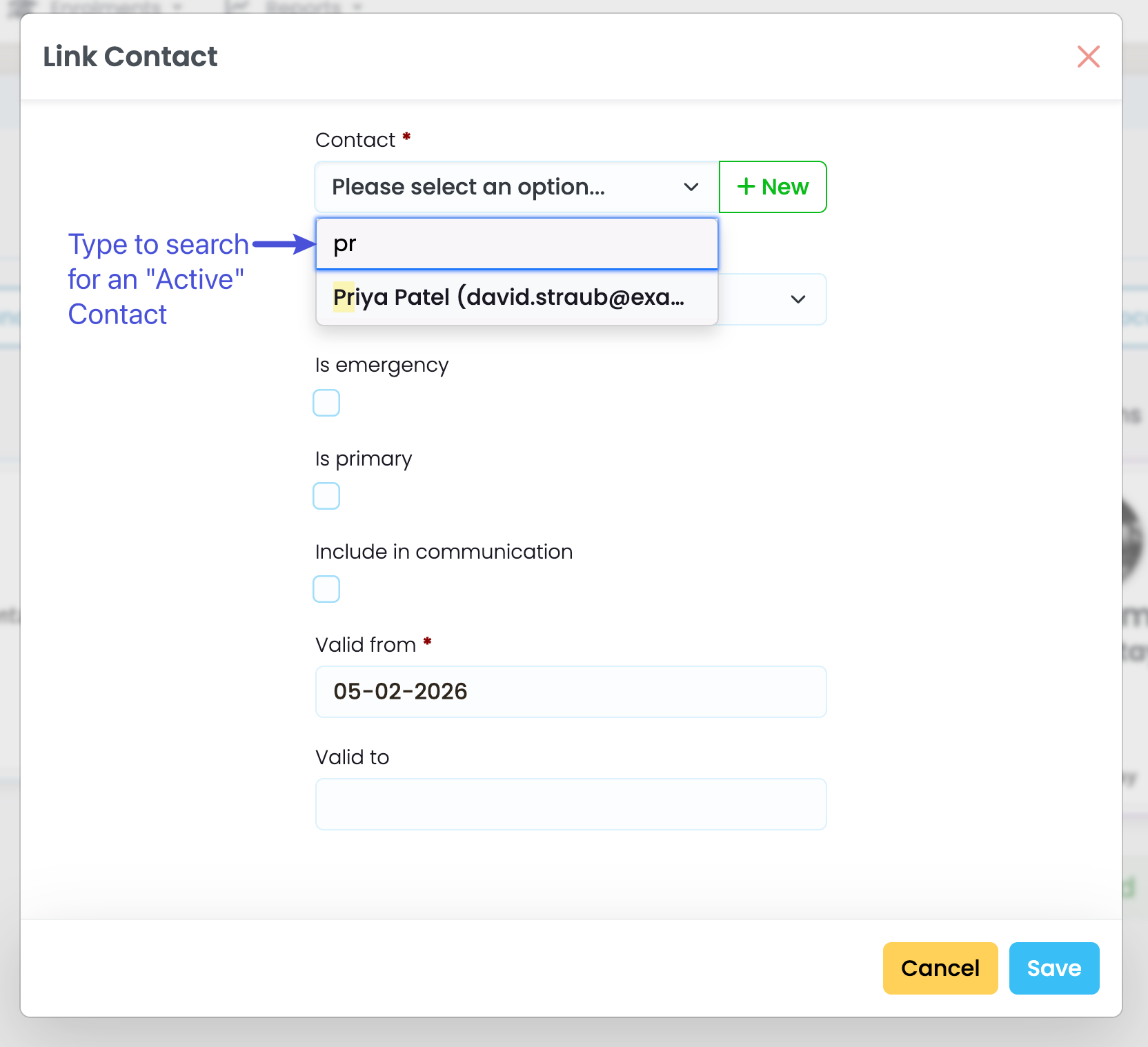 The number of “Active” Contacts that is shown in the “Contact” drop-down list is limited. Type a Contact name to search, and display matching contacts. If the type you need doesn’t exist, jump to Add New Association Type.