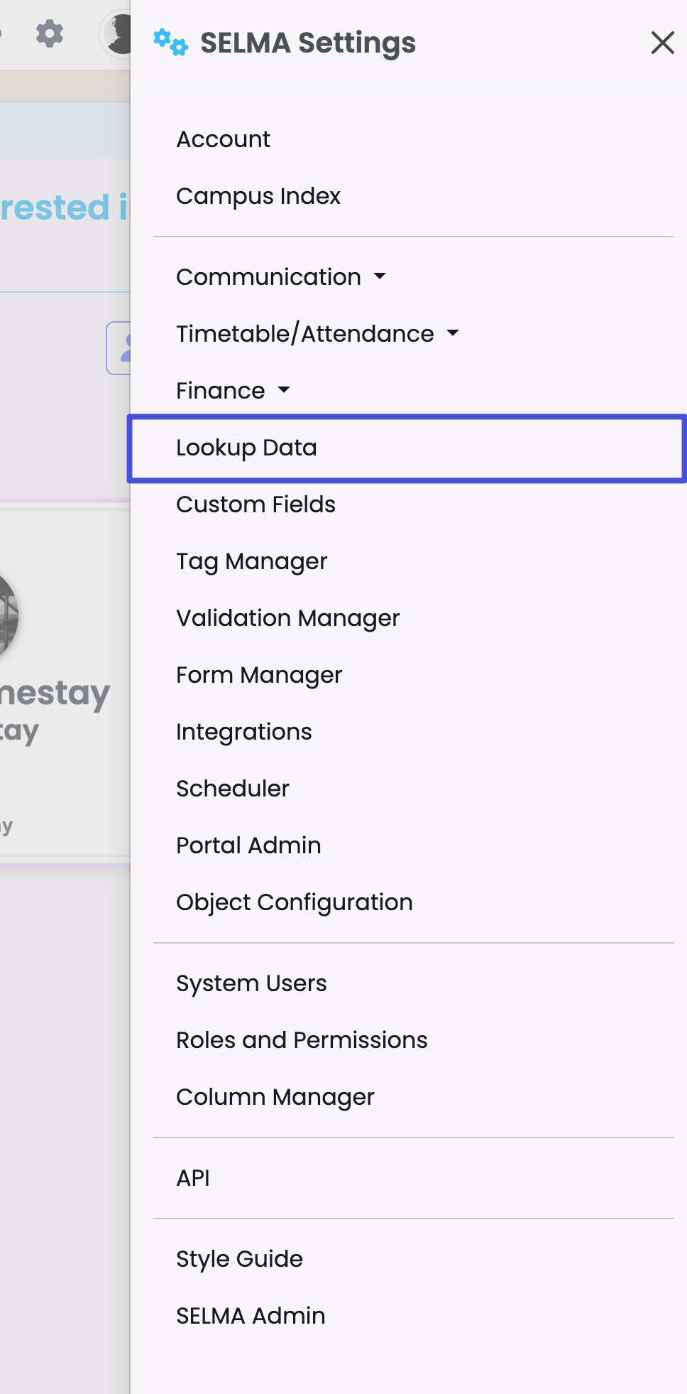 Click the Settings icon in the navigation bar. From the expanded menu, select Lookup Data.