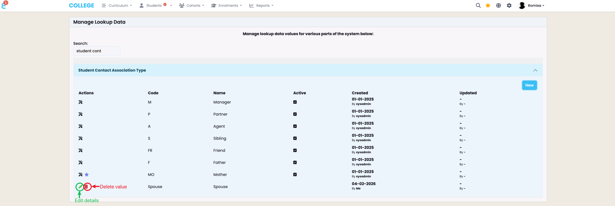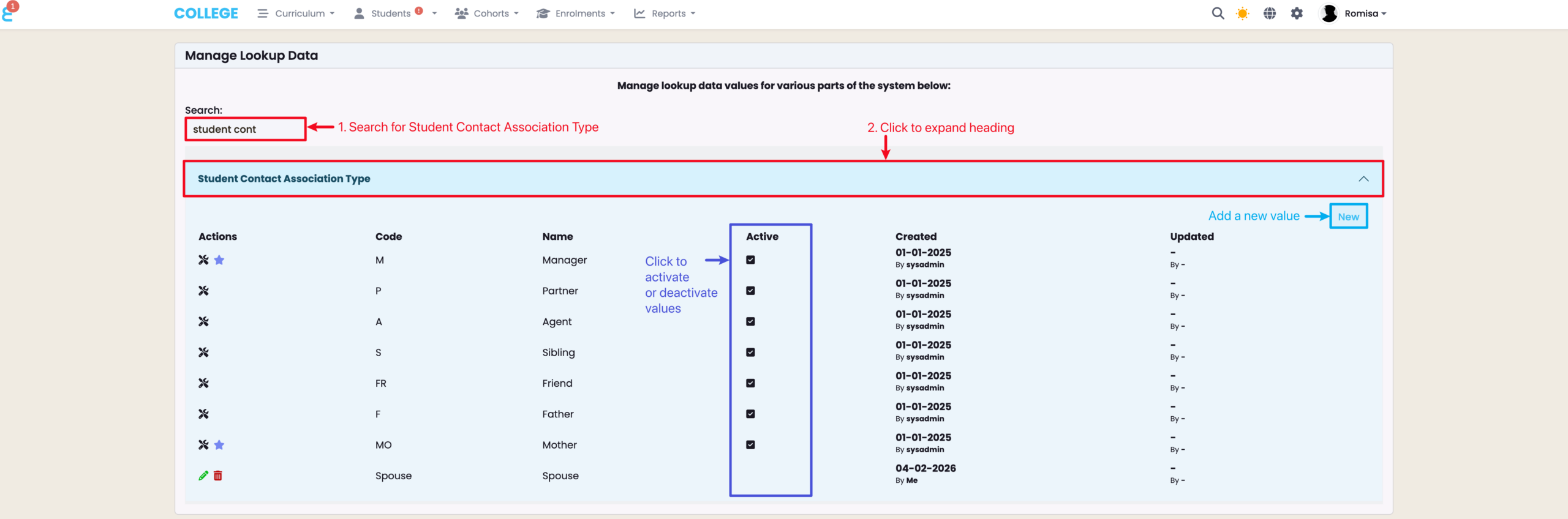 Find the heading “Student Contact Association Type” and click to expand it. You can deselect a value to mark it as “Inactive”, or create a new value entirely clicking the blue “New” button.