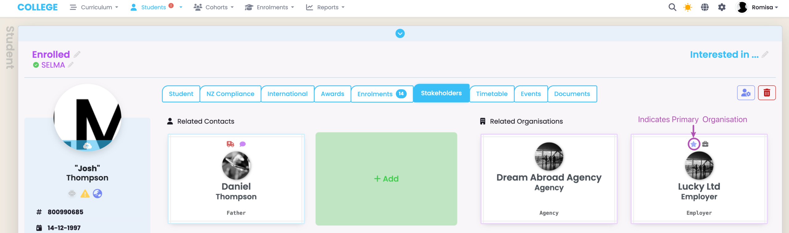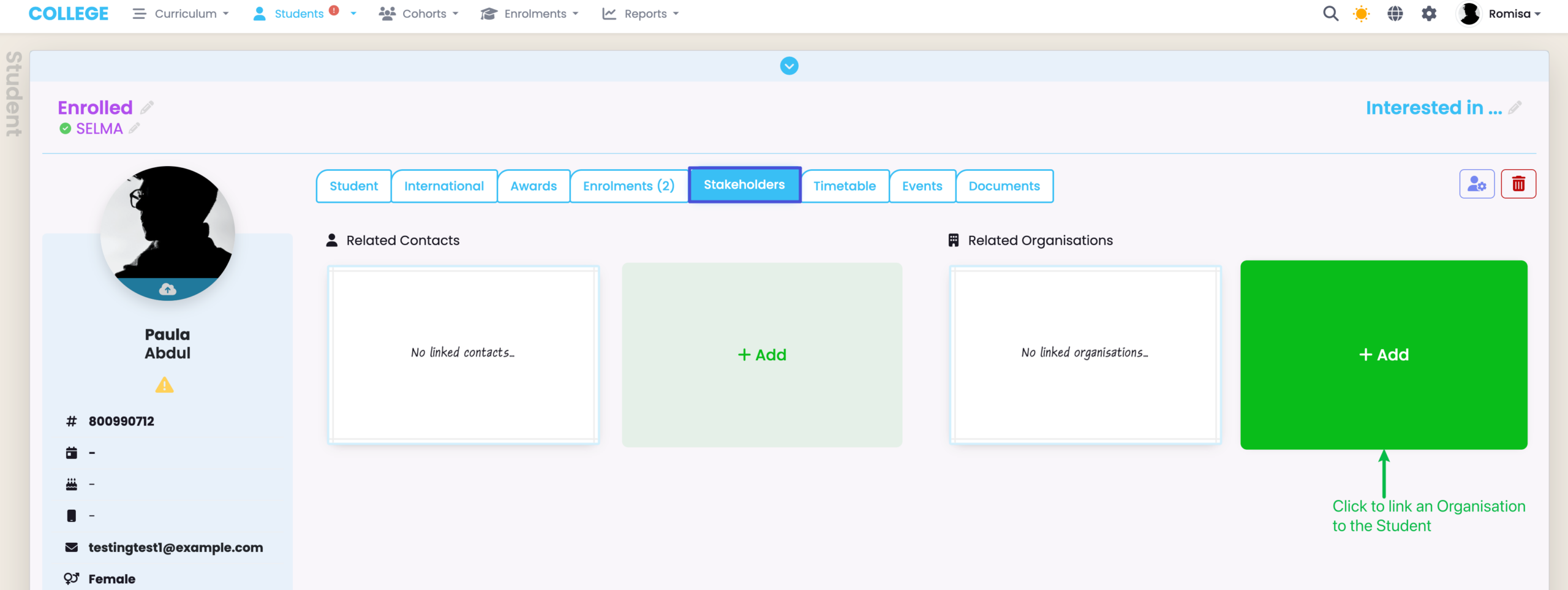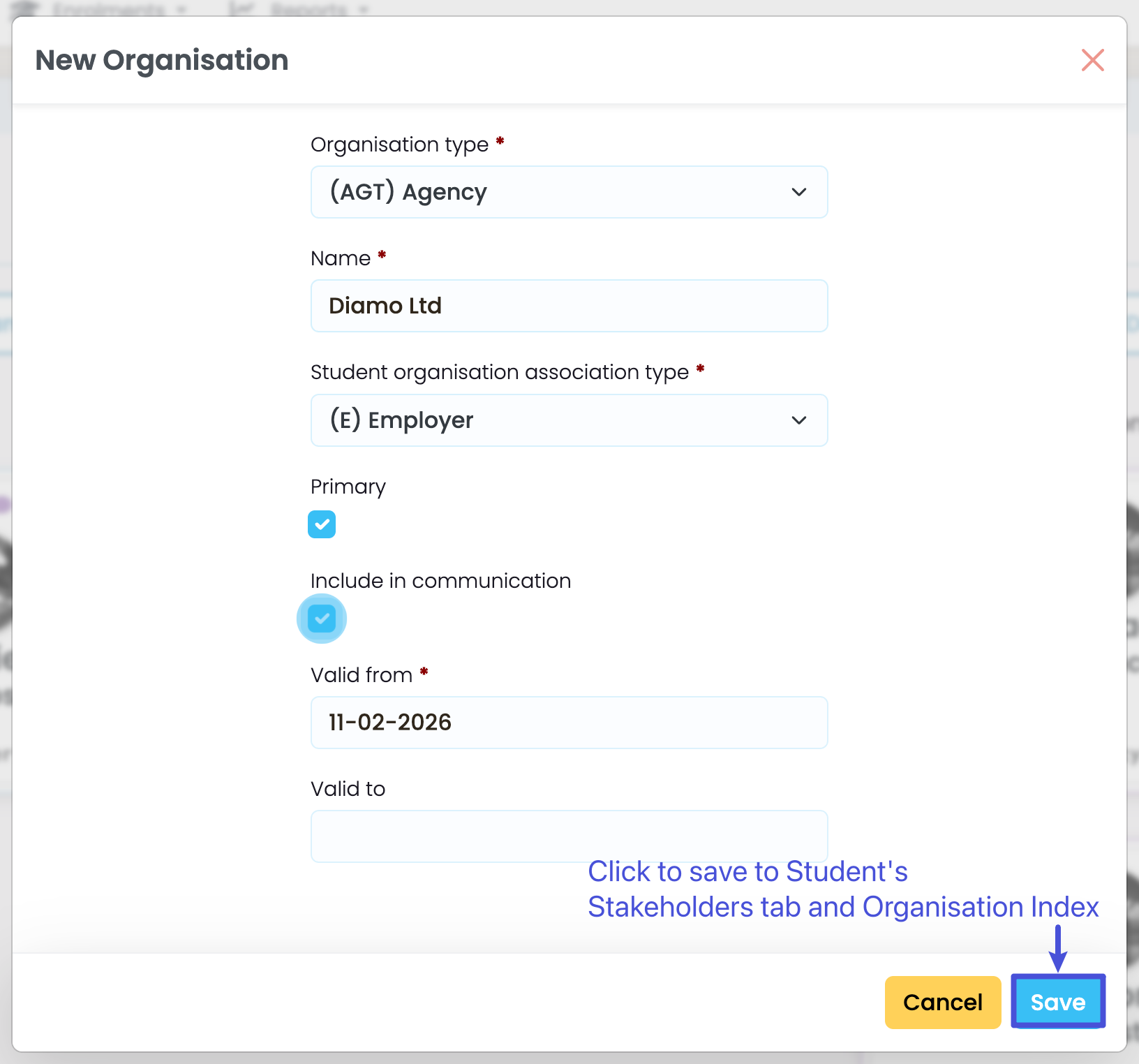 - Create a new Organisation from the Organisation Index, then link them via the Student’s Stakeholders tab.