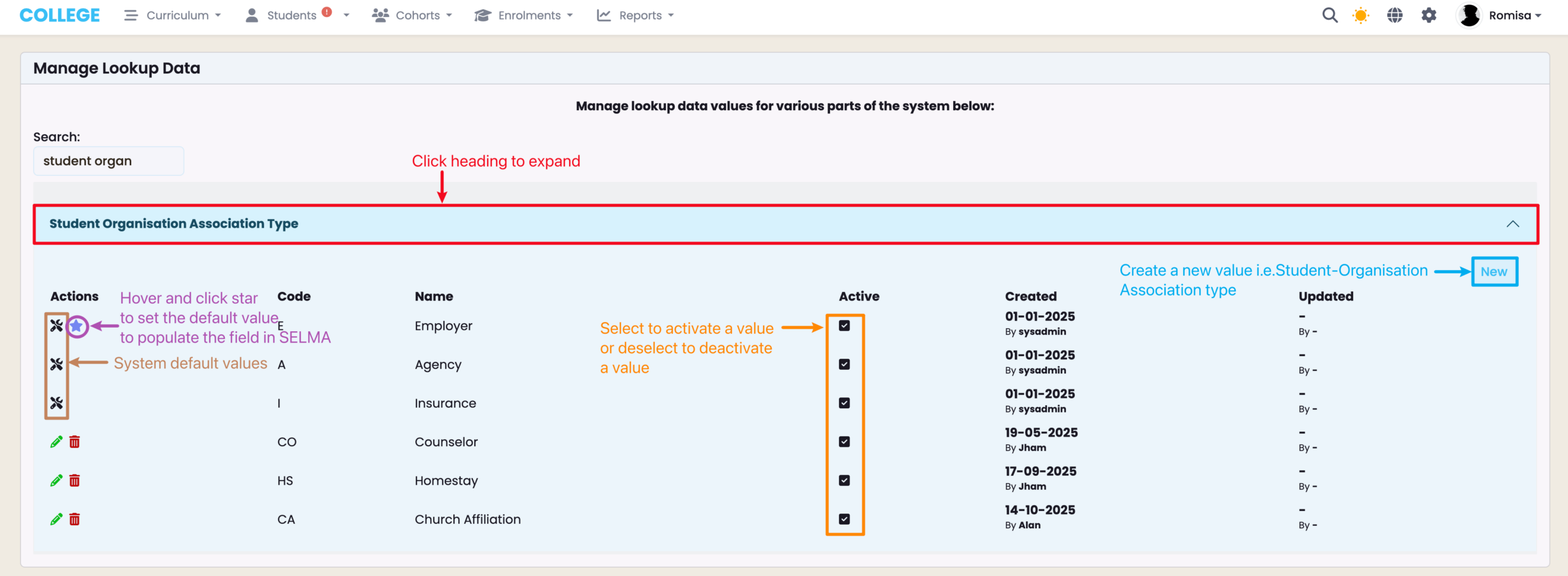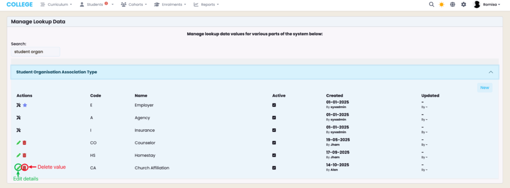 Figure 3iv. Edit Student Organisation Association Type Value
