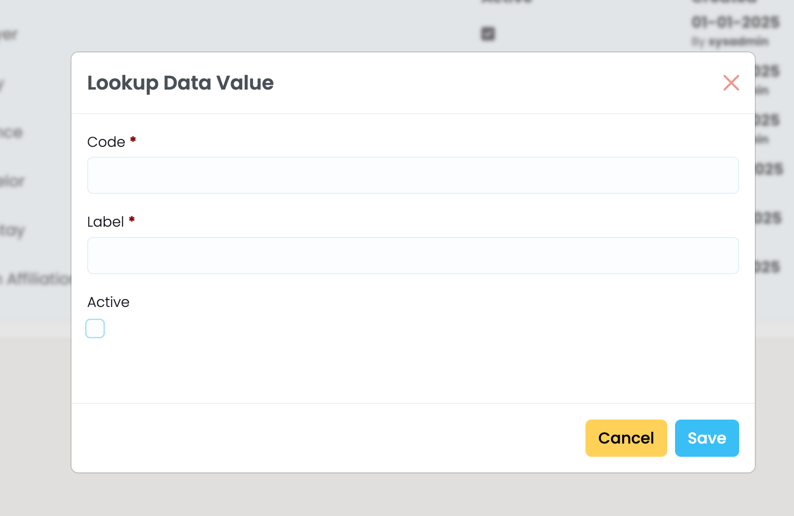 When you choose to add a new value, you will see a pop-up form where you can add a simple code in the “Code” field, and add a name in the field “Label“. Click the “Active” check-box to ensure the data value shows up for use as a Student Organisation Association Type in SELMA.