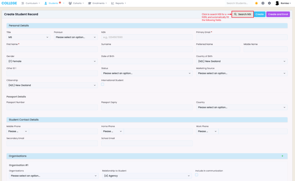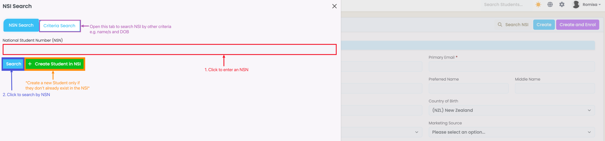 NOTE: There is an option to create a new Student in the NSI. Please select the related button ONLY if you are sure they don’t exist in the NSI already. Creating duplicate data may result in the MoE revoking your provider’s access to the NSI.