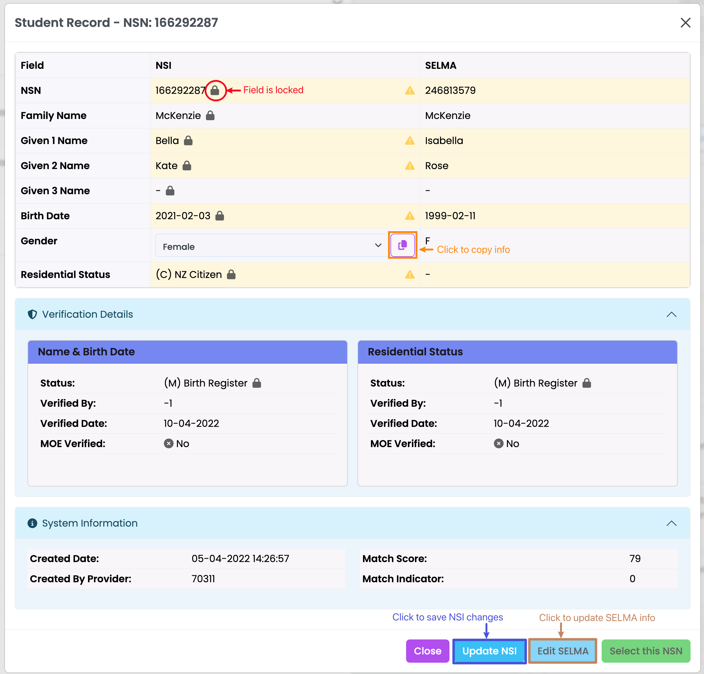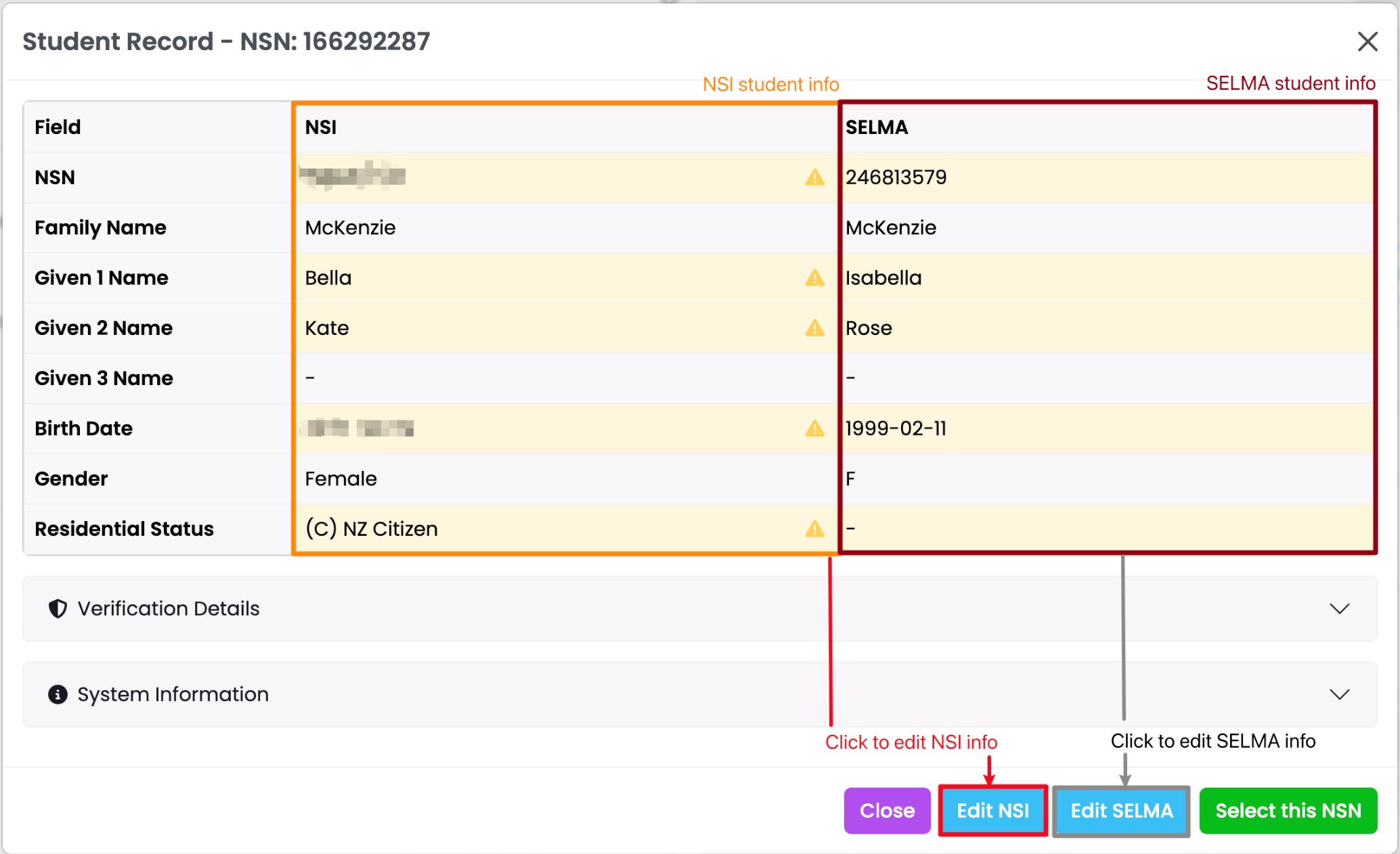 Figure 7. Two columns in the Student Record separate the NSI Student information (orange) from the SELMA Student information (burgundy). Click “Edit NSI” (red) or “Edit SELMA” (grey), to update the appropriate fields. The green button “Select this NSN” populates fields with that NSN.