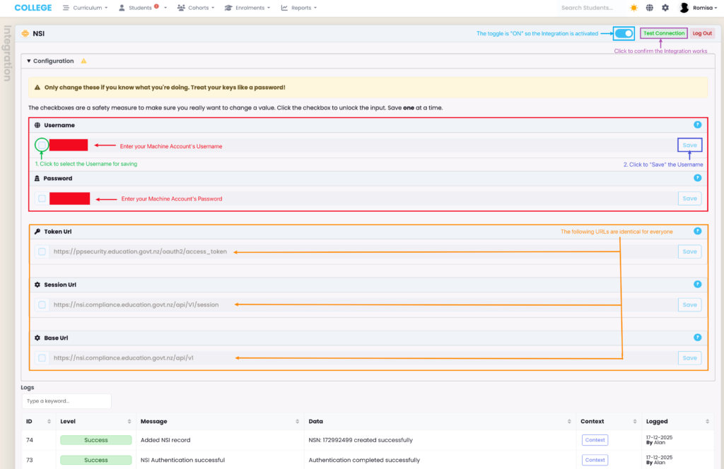 Figure 2. Open the drop-down list by clicking the heading “Configuration” and enter your Machine Account’s Username and Password (red). To “Save” the Username/Password, select the tick-box under each corresponding heading (green), then click the “Save” button for each field (blue). Ensure the toggle is “ON” (blue), and click the toggle if not. You can then confirm that the Integration works by clicking “Test Connection” (purple).