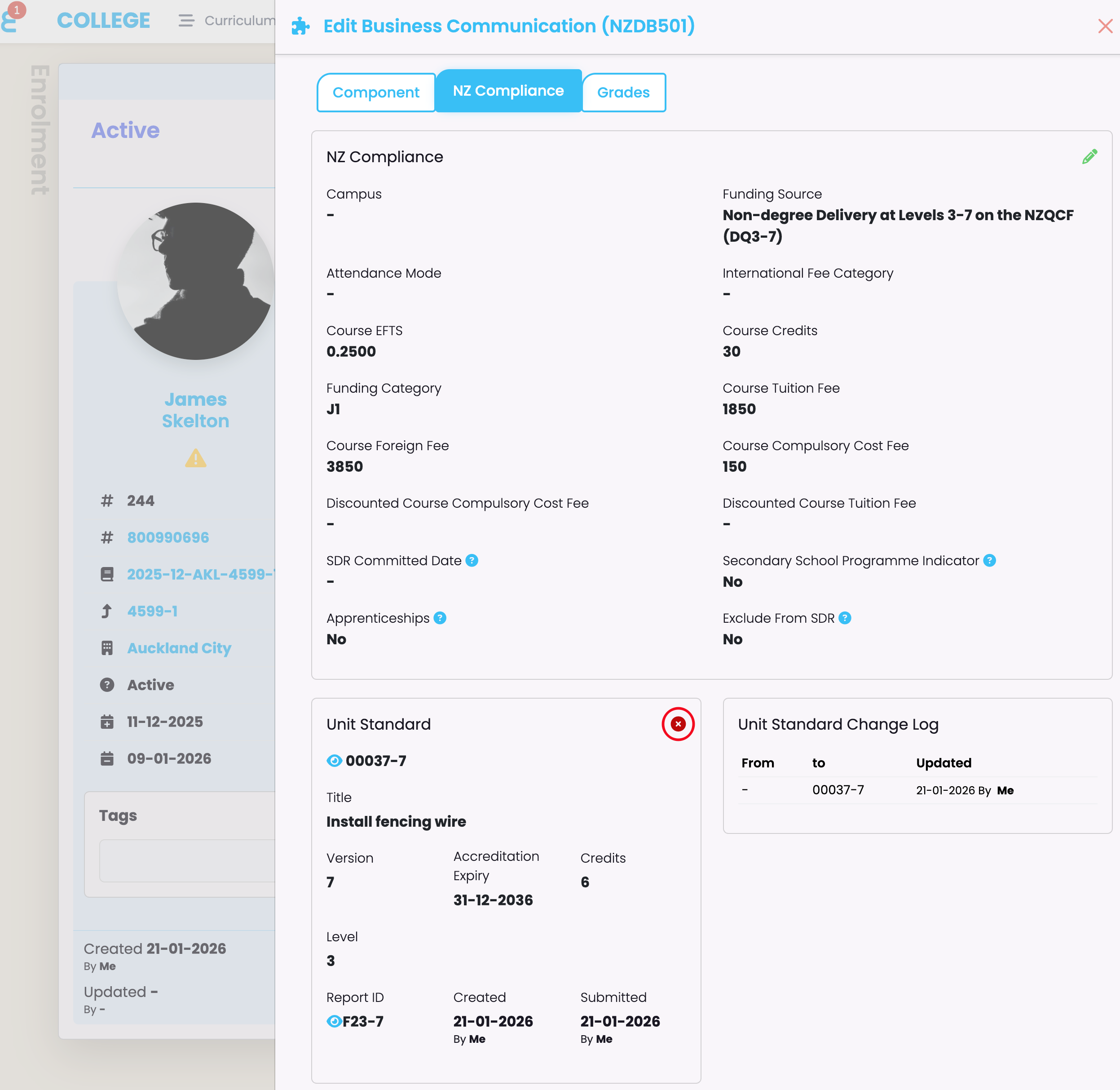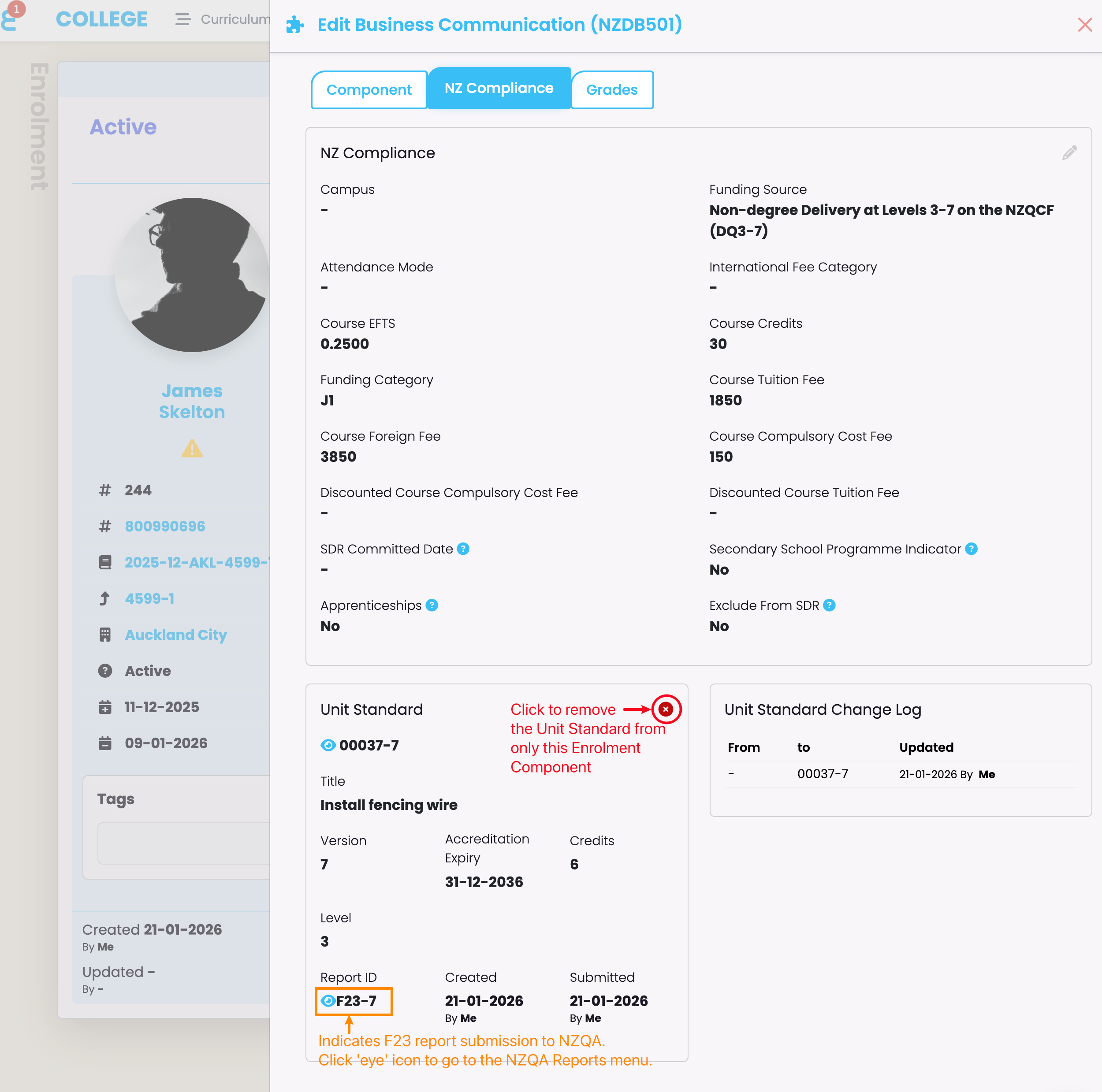 Navigate to the Enrolment Component and check that there is a “Report ID” present, where the Unit Standard is linked (orange). This indicates that the Unit Standard has been reported to NZQA as a batch file submission.