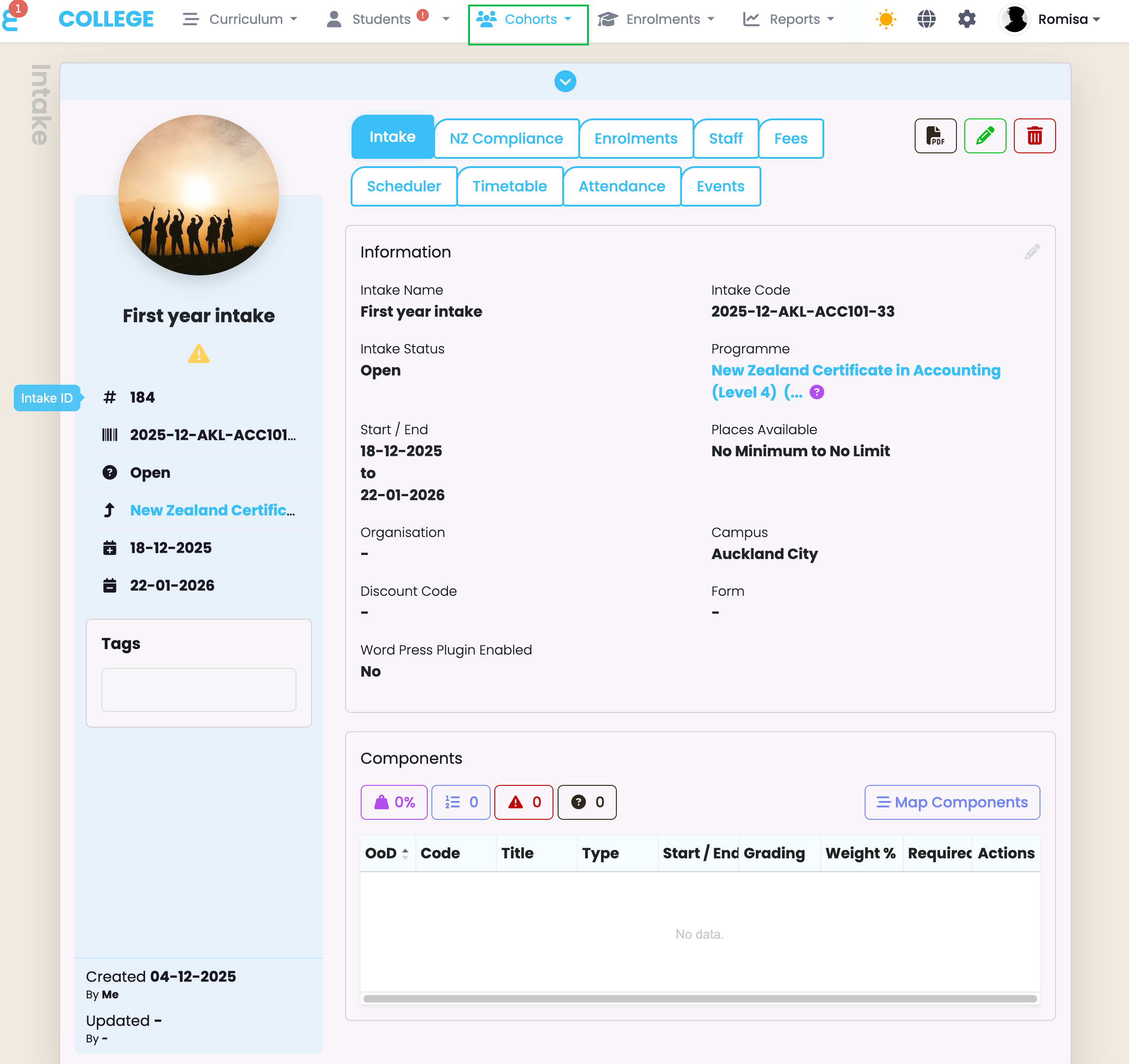 Figure 12. A newly created intake from Programmes displays as a page under Cohorts, as it is saved there, too.